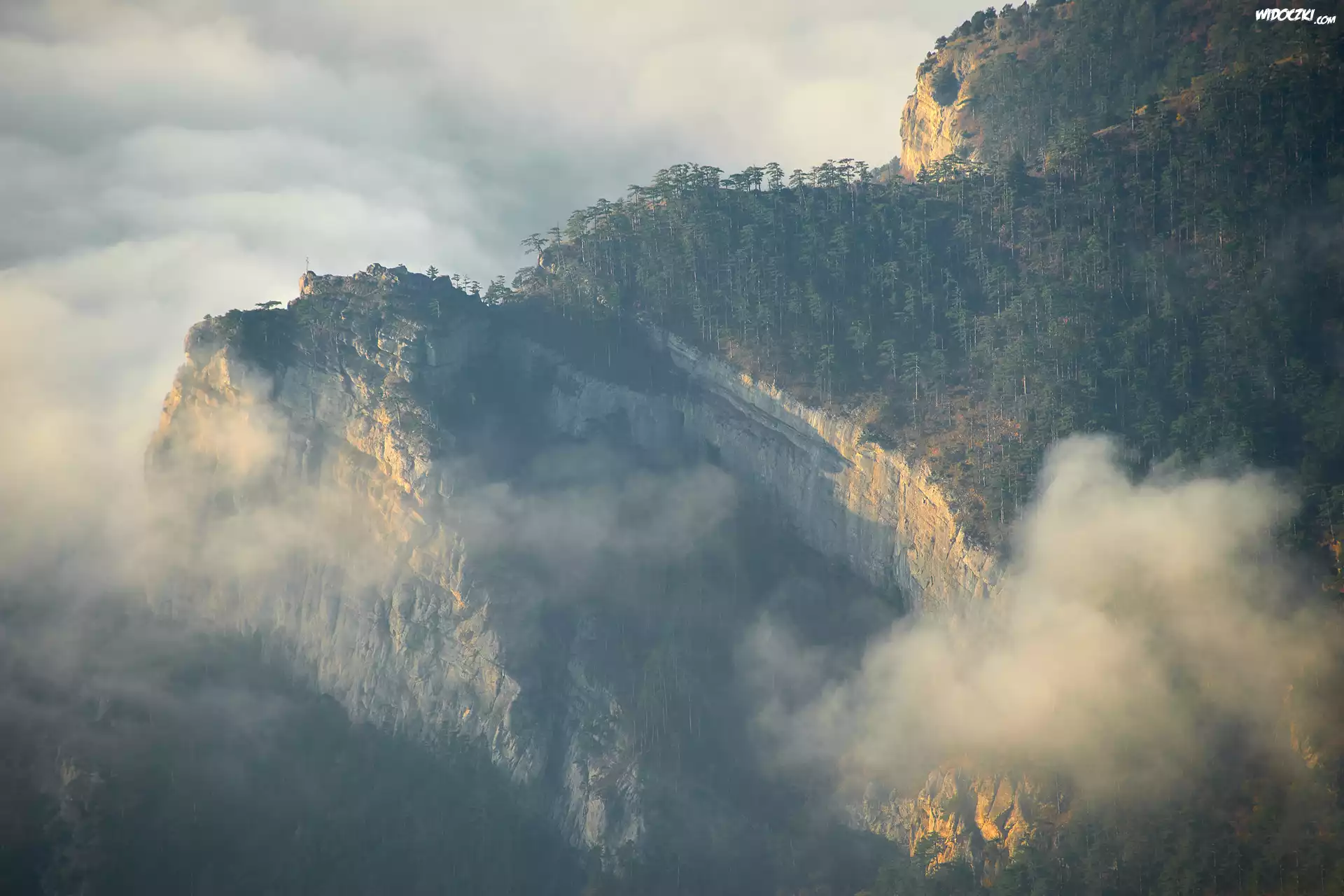 Zdjęcia, Góry, Mgła, Chmury, Drzewa