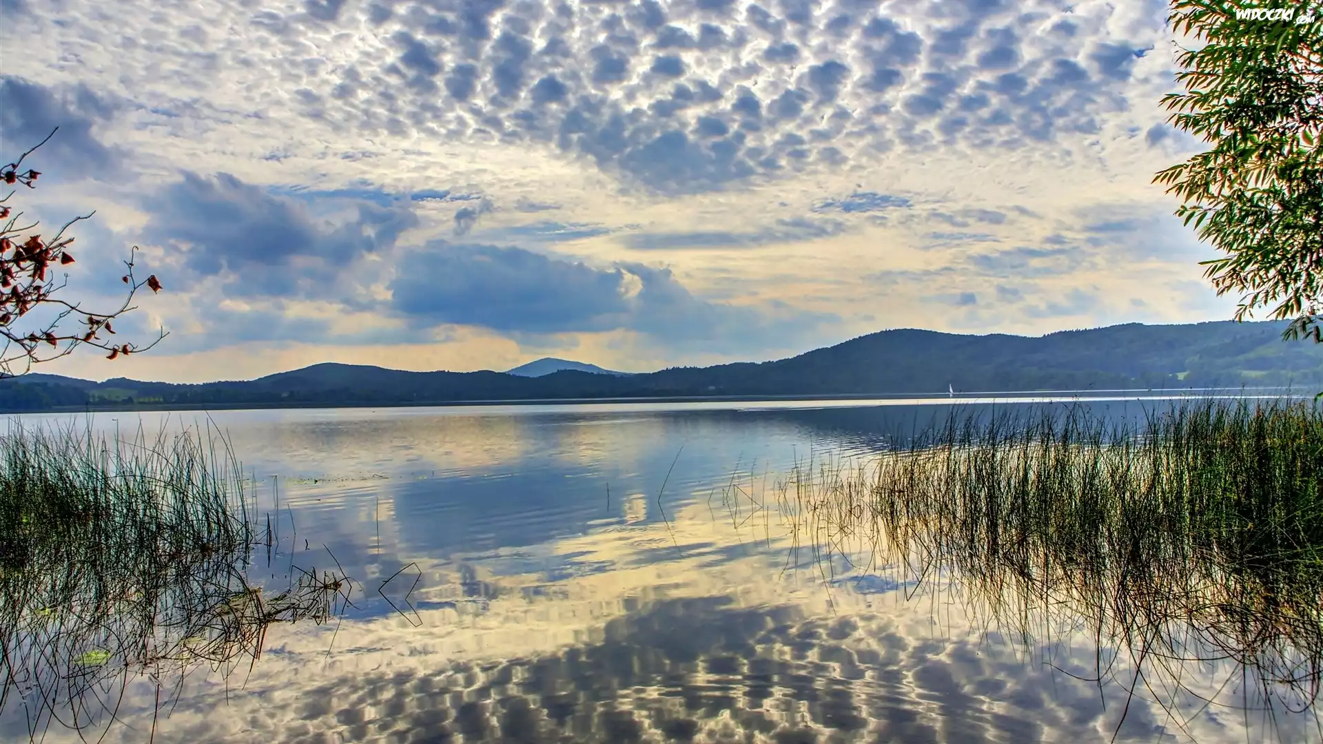 Góry, Jezioro, Niebo, Chmury, Trawa