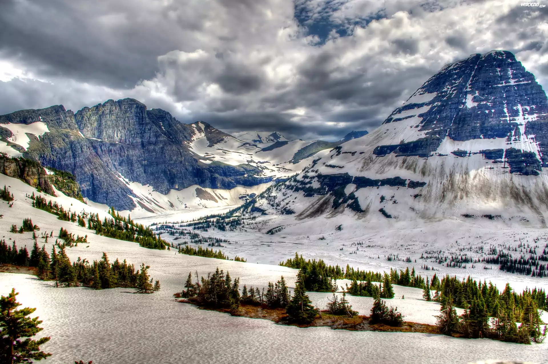 Zdjęcia, Góry, Śnieg, Chmury, Drzewa