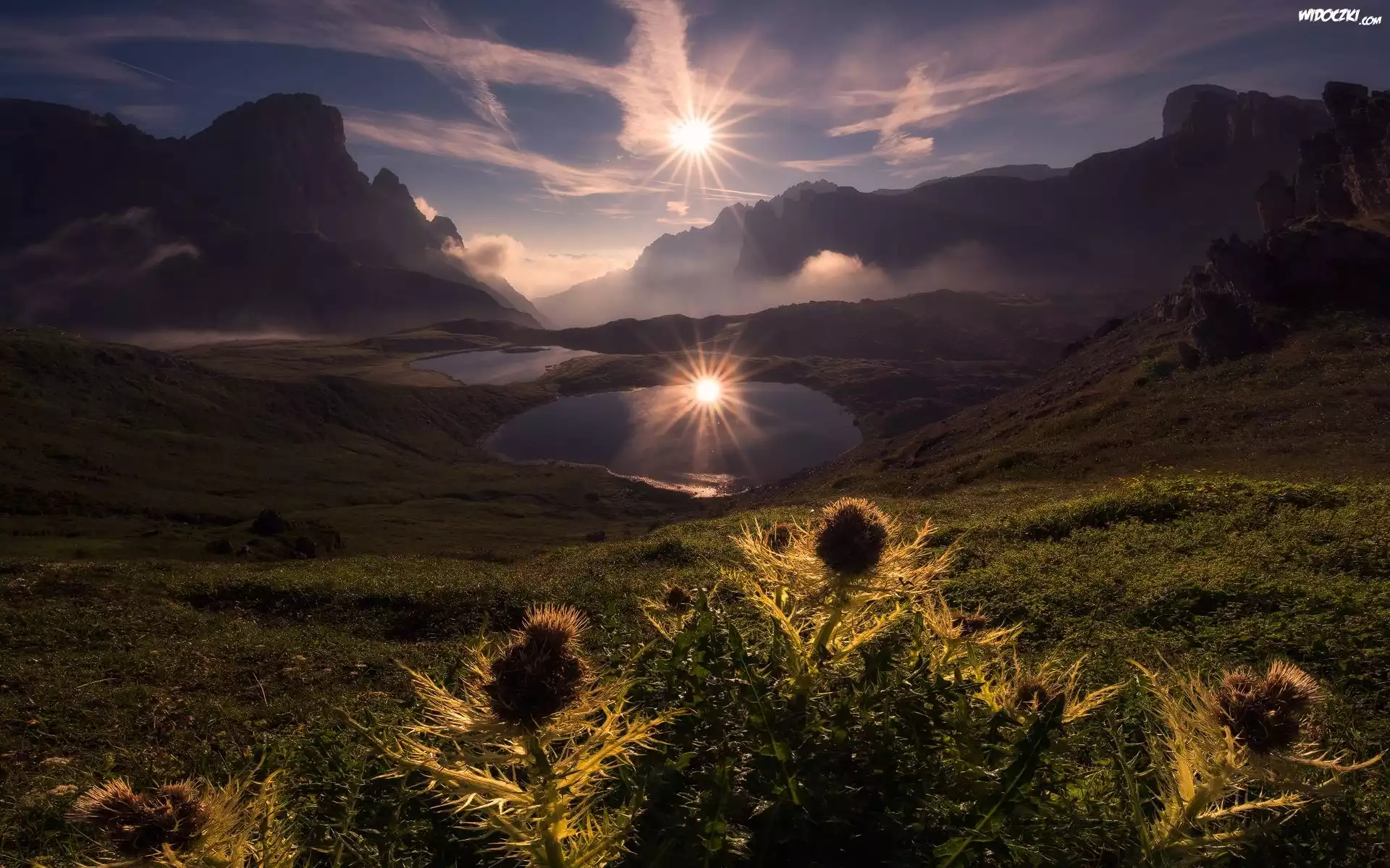 Góry, Jeziora, Promienie słońca, Chmury, Rośliny