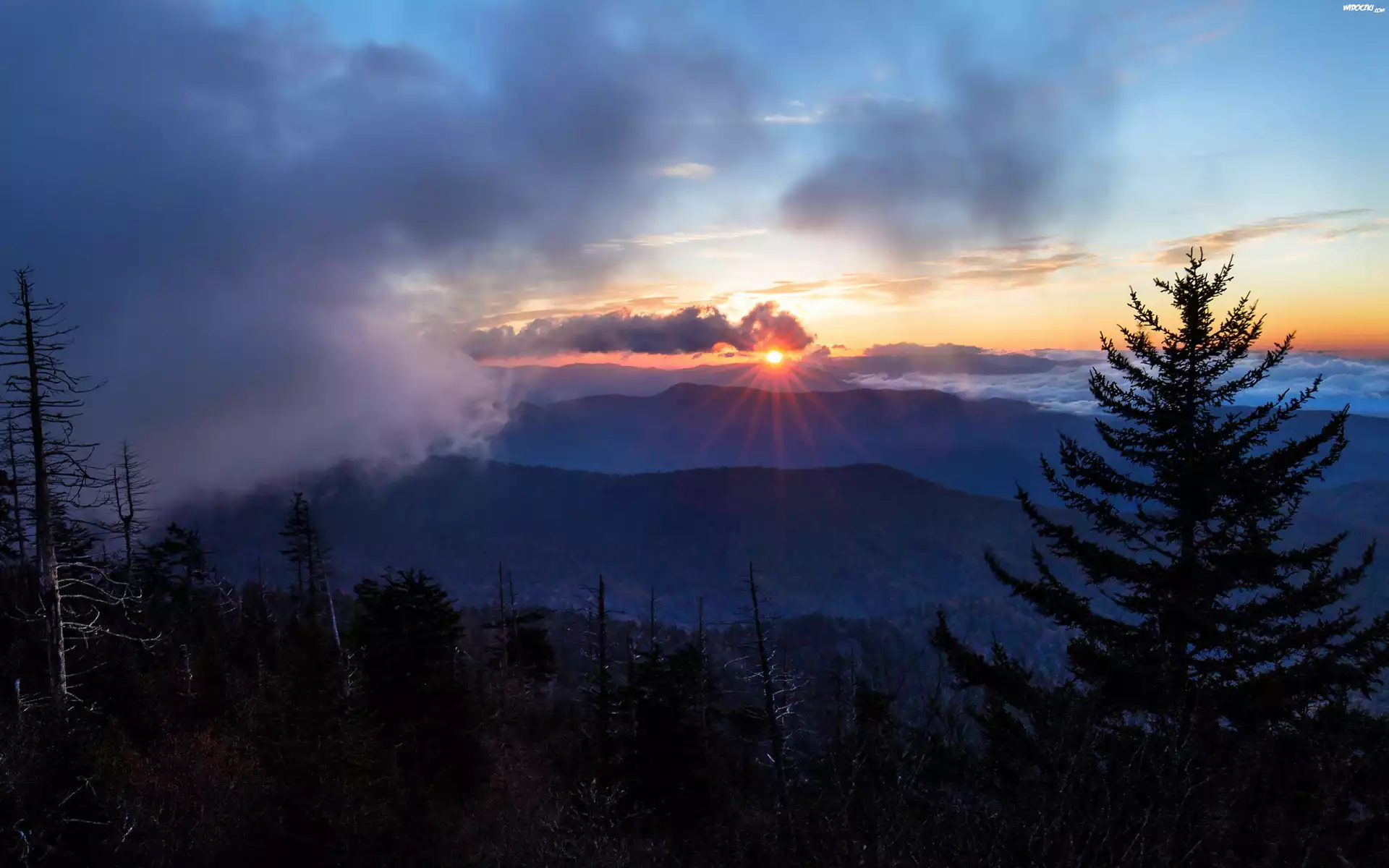 Zdjęcia, Góry, Słońce, Chmury, Las