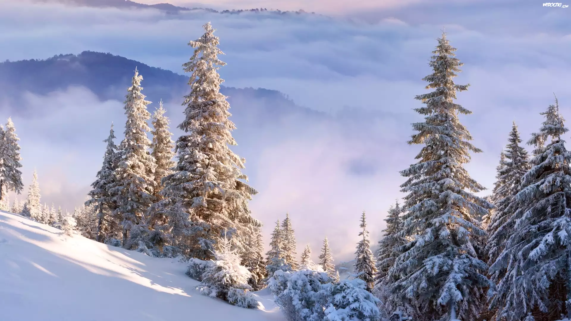 Zdjęcia, Góry, Stok, Świerki, Chmury, Zima