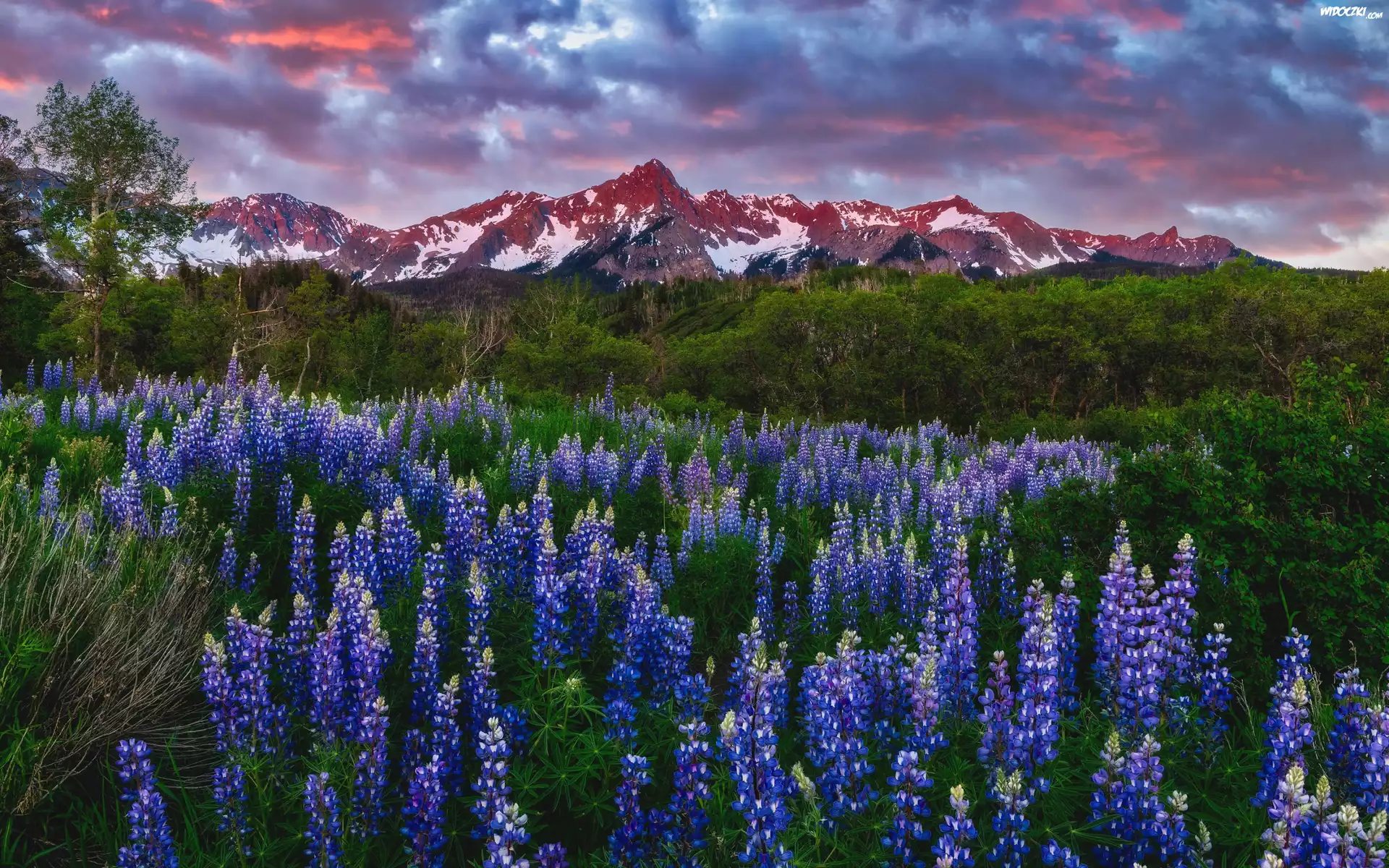 Zdjęcia, Góry, Polana, Kwiaty, Łubin, Drzewa, Zieleń, Chmury, Zachód słońca