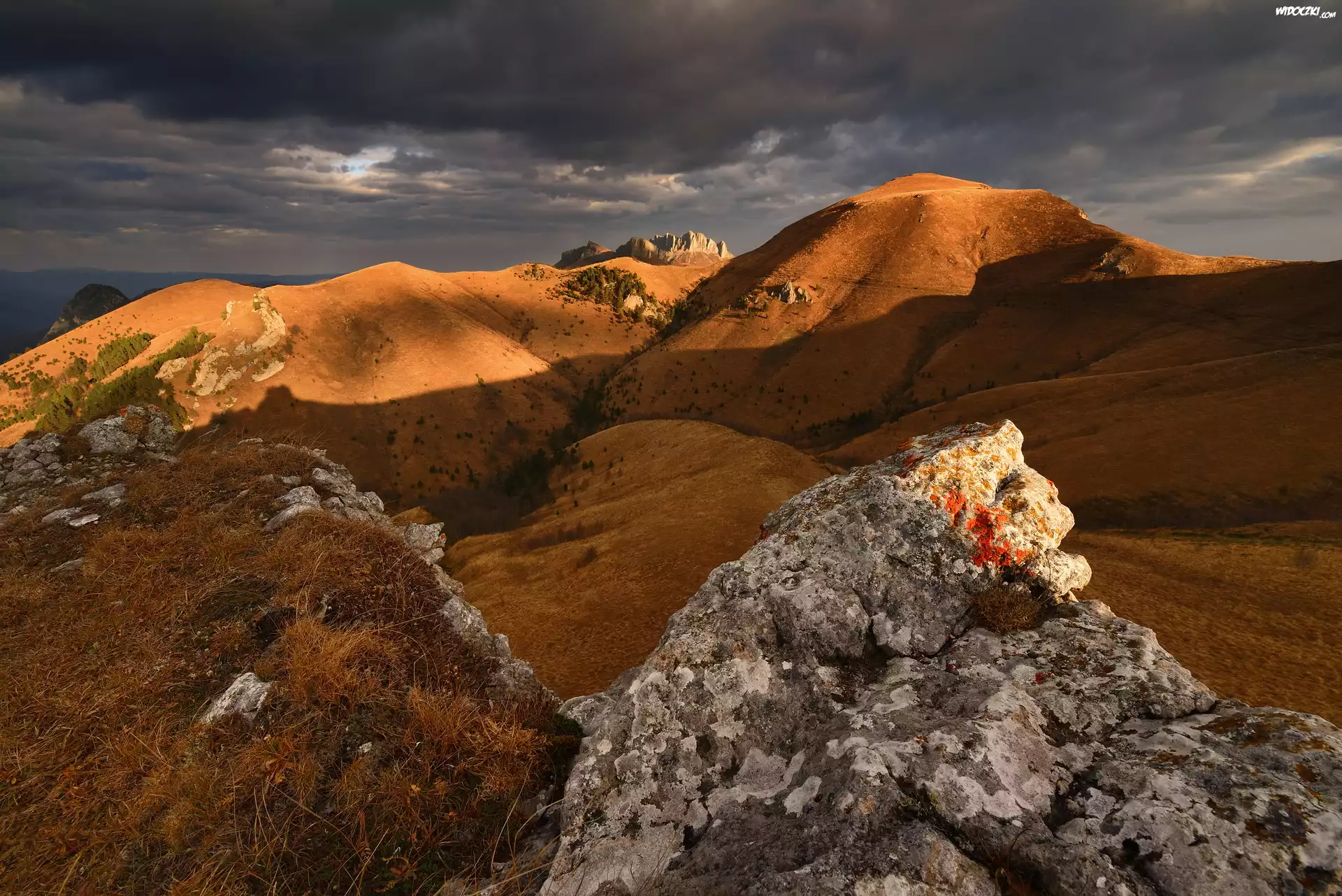 Góry, Skały, Drzewa, Ciemne, Chmury