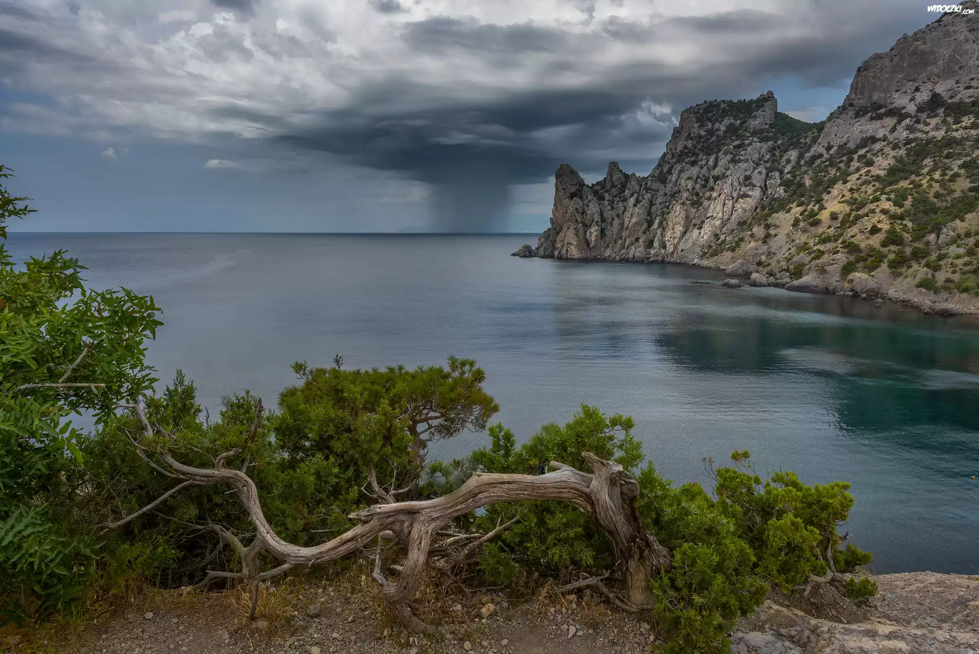 Zdjęcia, Góry, Skały, Morze, Roślinność, Ciemne, Chmury