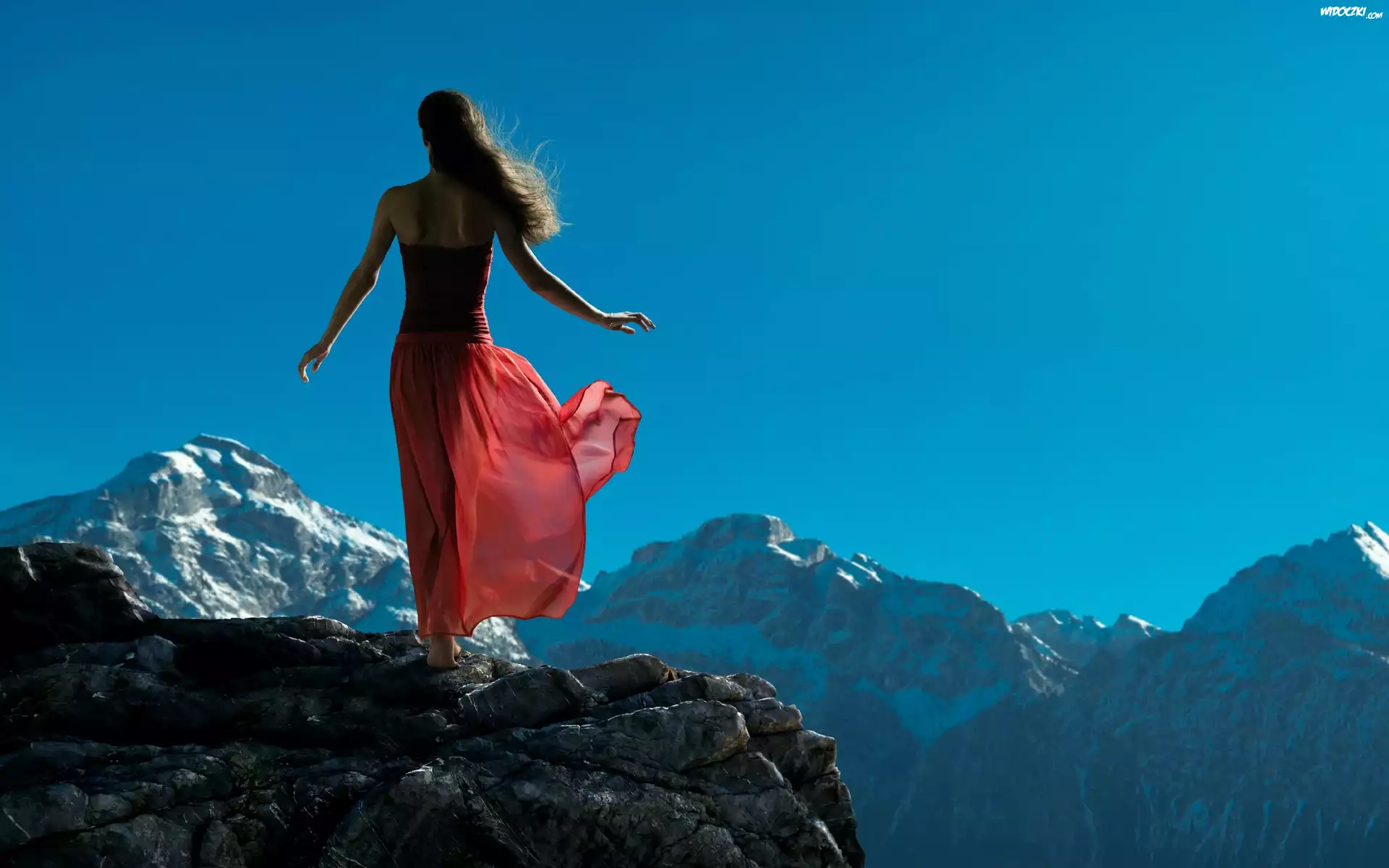 Zdjęcia, Góry, Szczyt, Kobieta, Czerwona, Sukienka