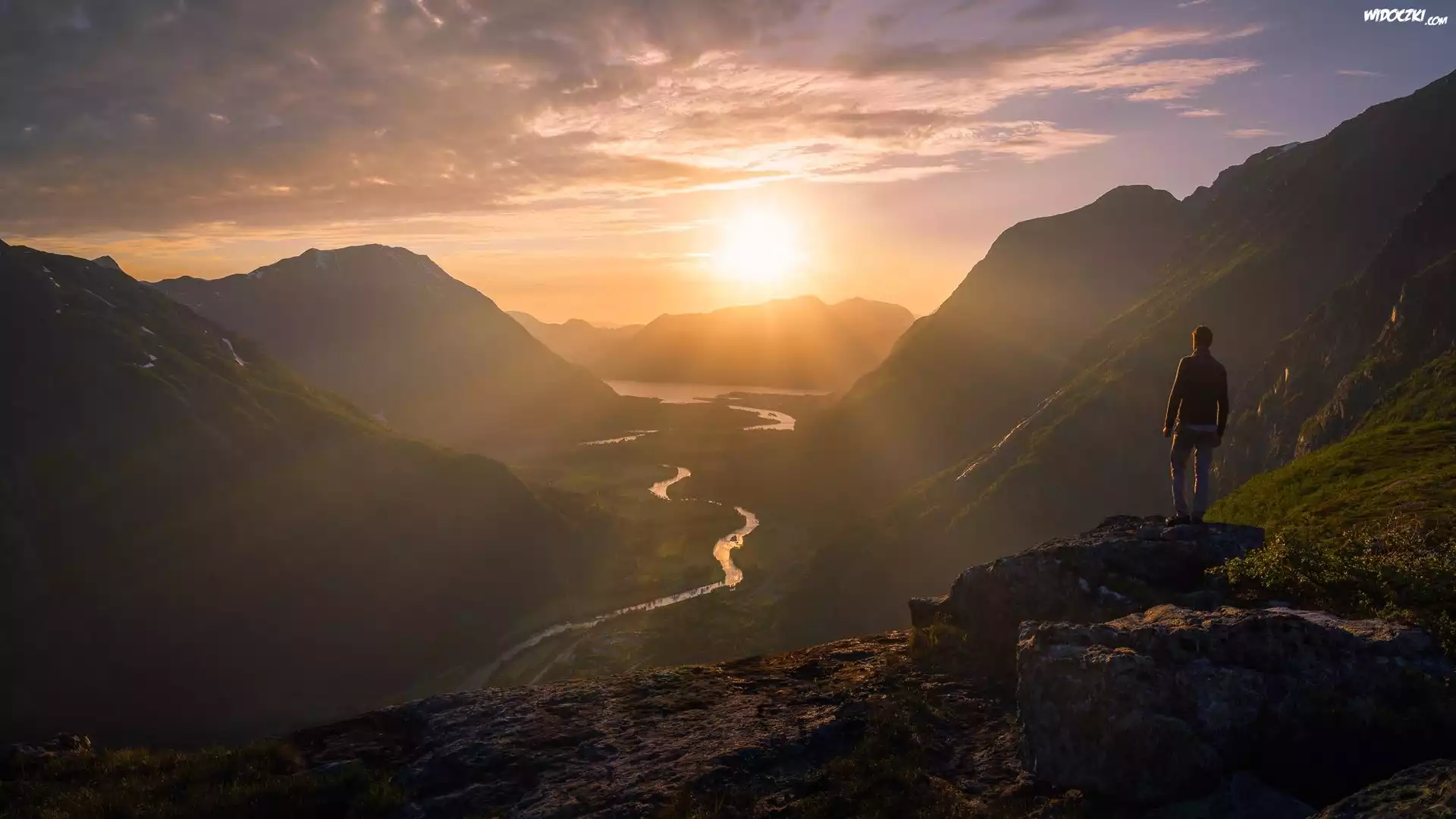 Góry, Rzeka, Wschód słońca, Człowiek, Dolina