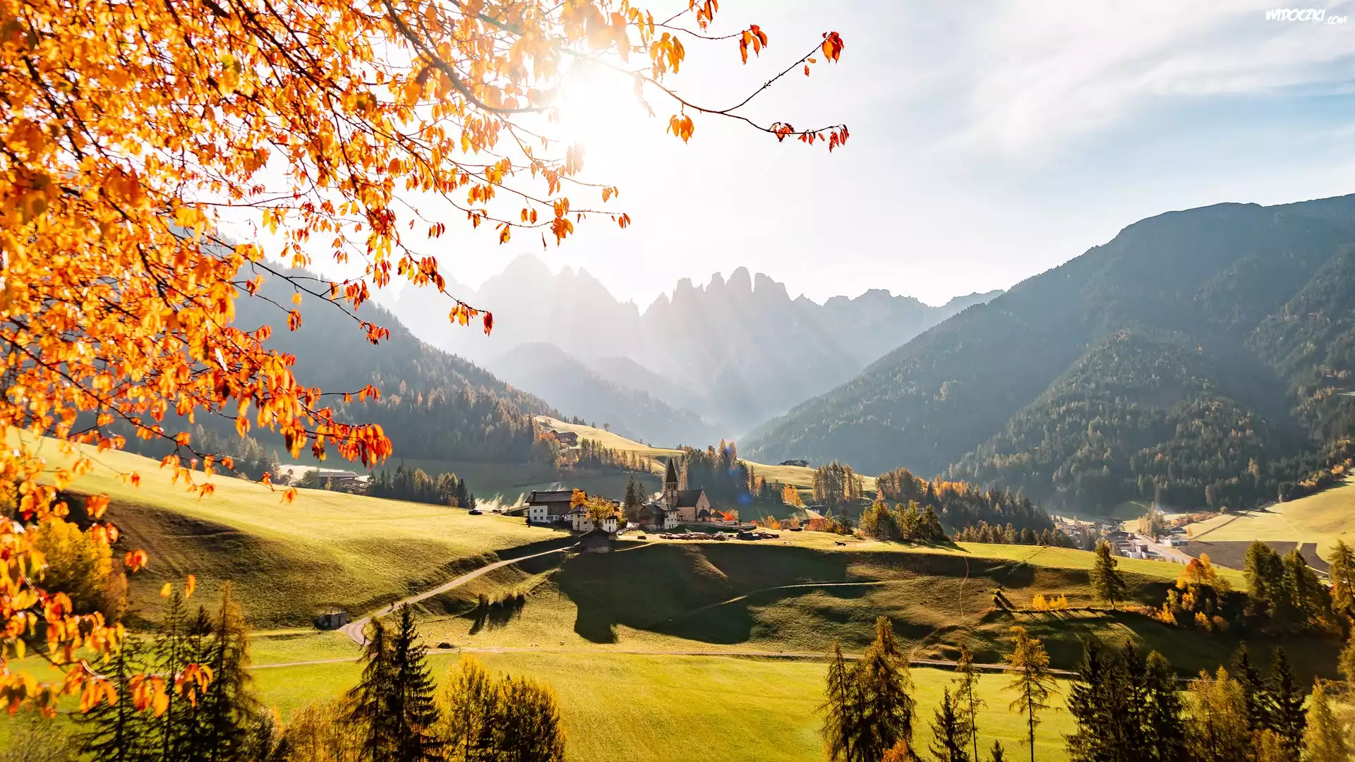 Góry, Dolomity, Masyw Odle, Wieś, Santa Maddalena, Dolina Val di Funes, Drzewa, Jesień, Lasy, Domy, Kościół, Włochy |