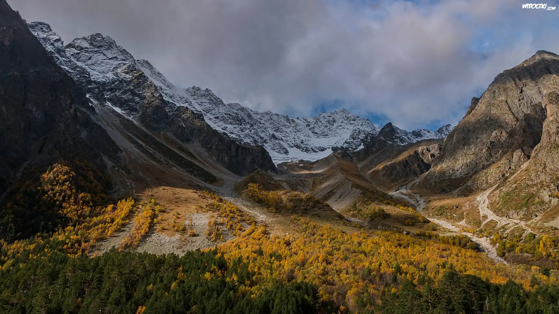 Zdjęcia, Góry, Śnieg, Dolina, Drzewa