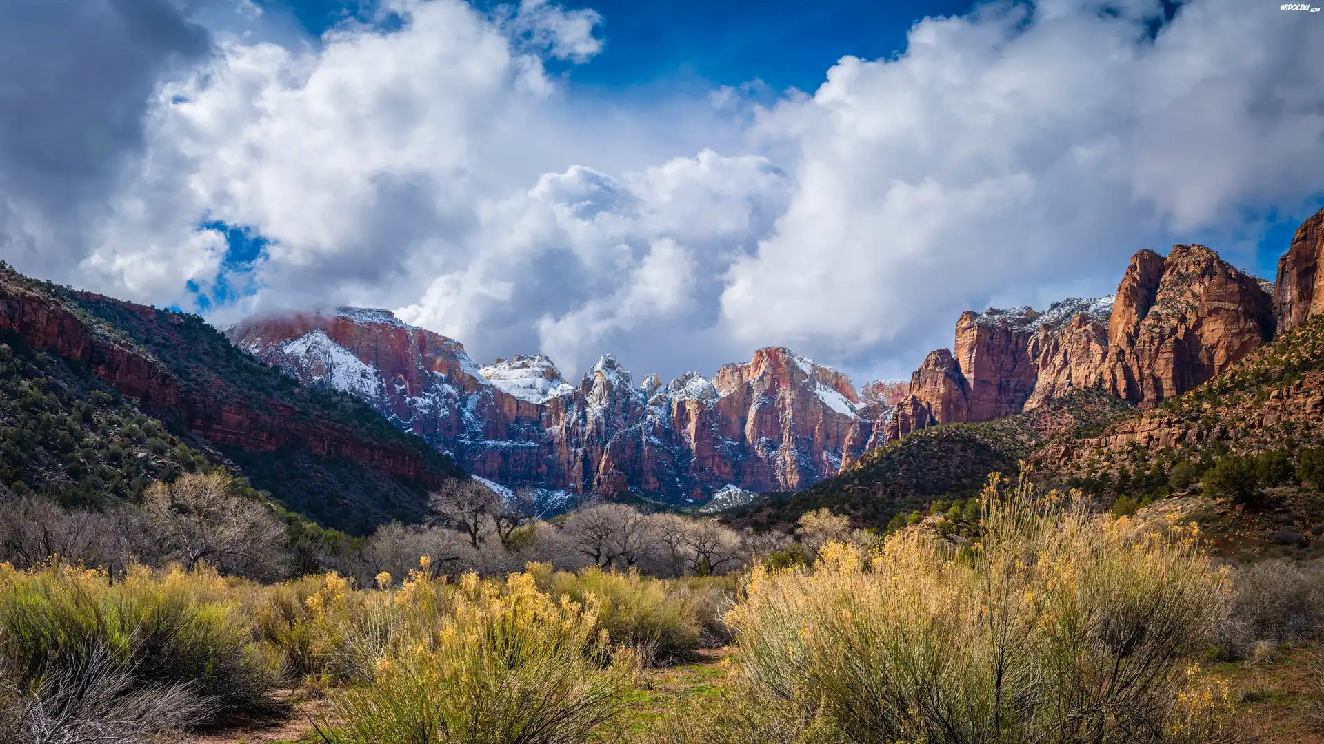 Zdjęcia, Chmury, Góry, Dolina, Skały, Roślinność