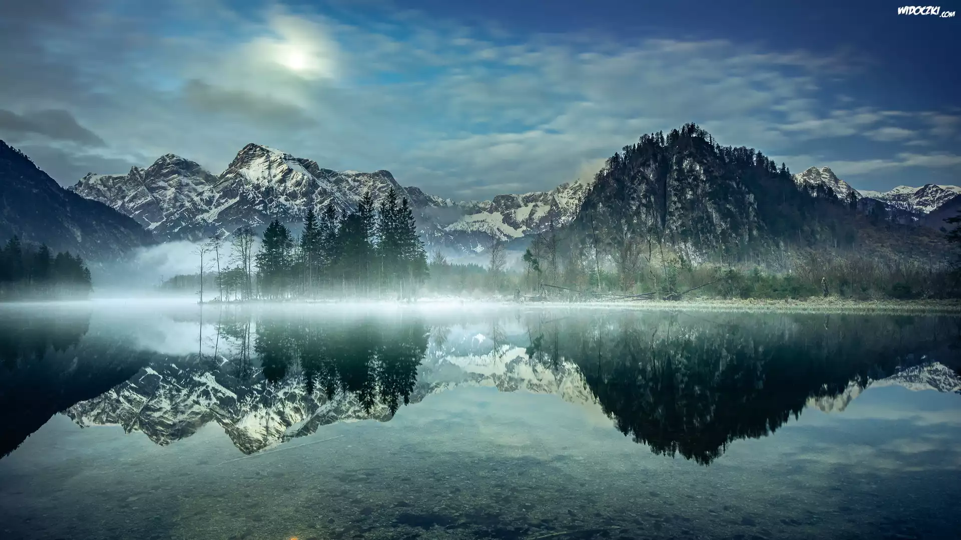 Wschód słońca, Góry, Alpy, Dolina Almtal, Jezioro Almsee, Drzewa, Mgła, Austria