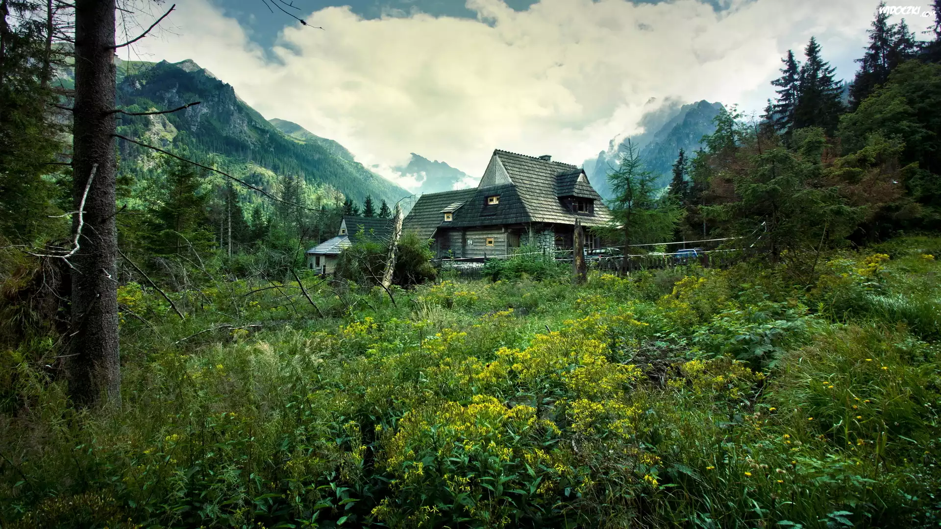 Zdjęcia, Góry, Chmury, Drzewa, Las, Dom, Łąka