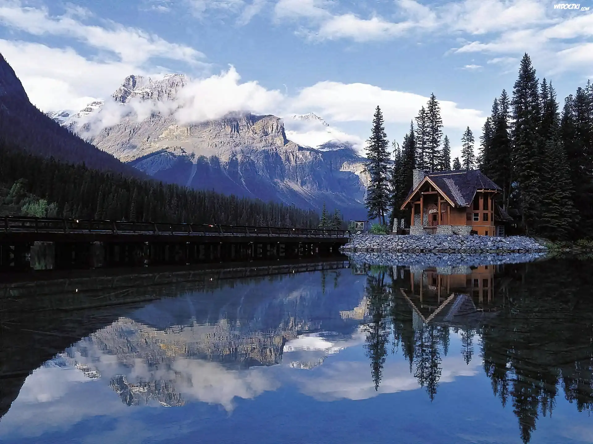 Zdjęcia,  Kanada, Park Narodowy Yoho, Jezioro Emerald Lake, Dom, Most, Góry, Drzewa