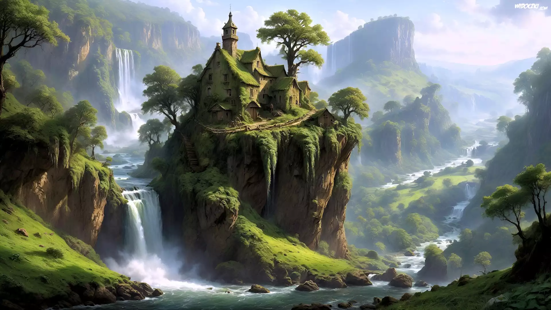 Zdjęcia, Grafika, Skała, Dom, Góry, Wodospad, Drzewa, Rzeka