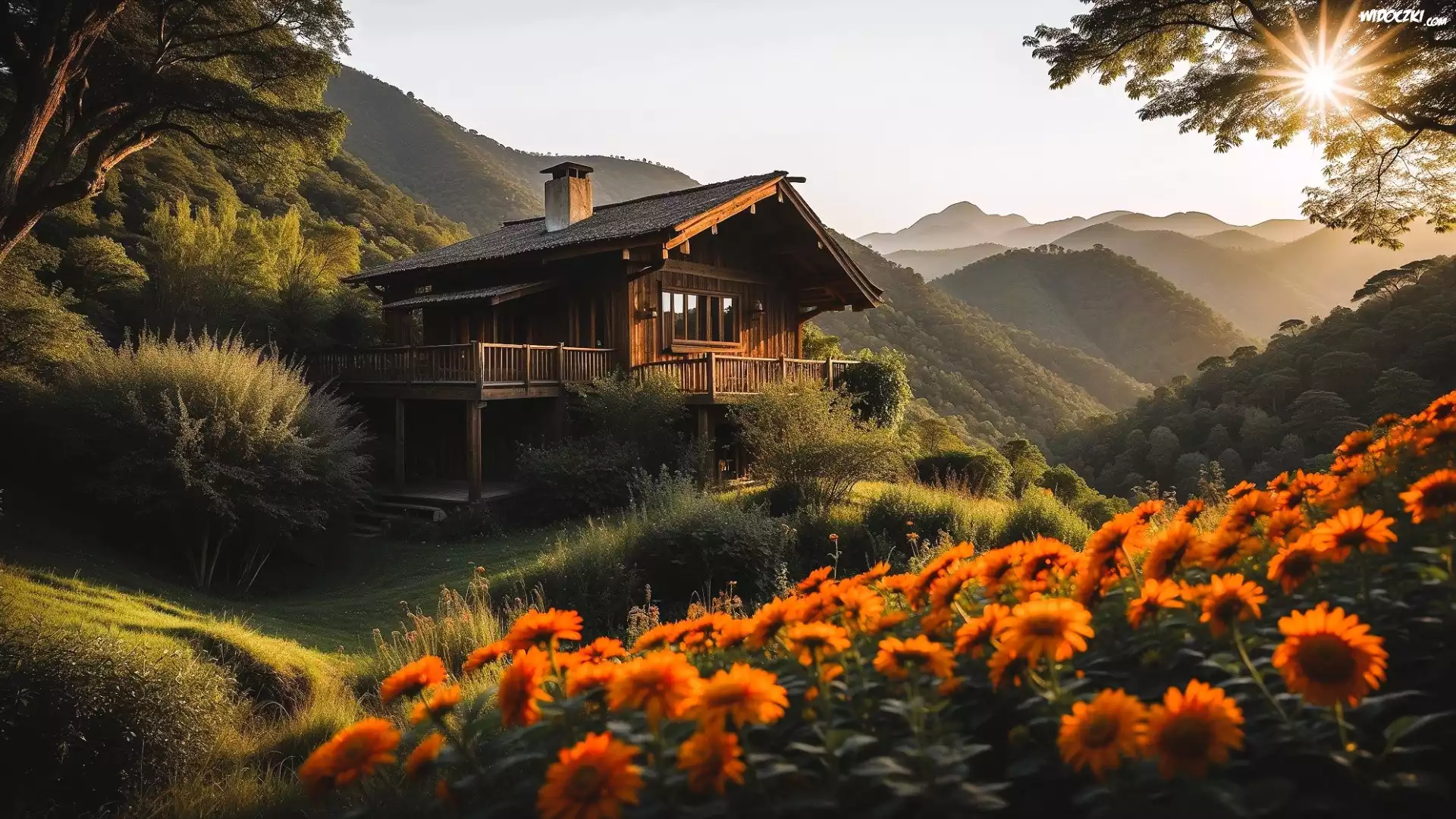Zdjęcia, Dom, Kwiaty, Wzgórze, Góry