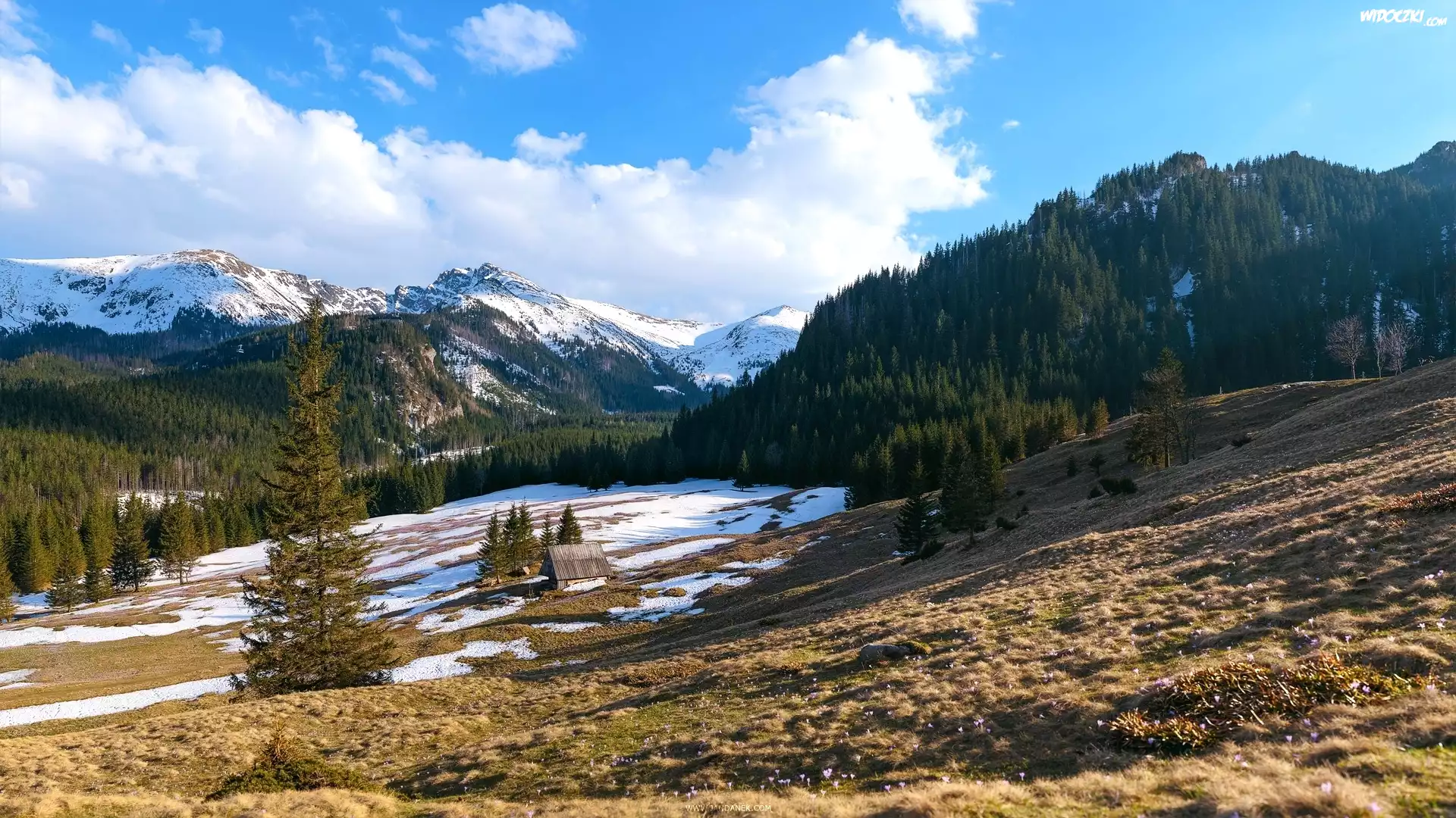 Zdjęcia, Góry, Wzgórza, Drzewa, Domek, Śnieg
