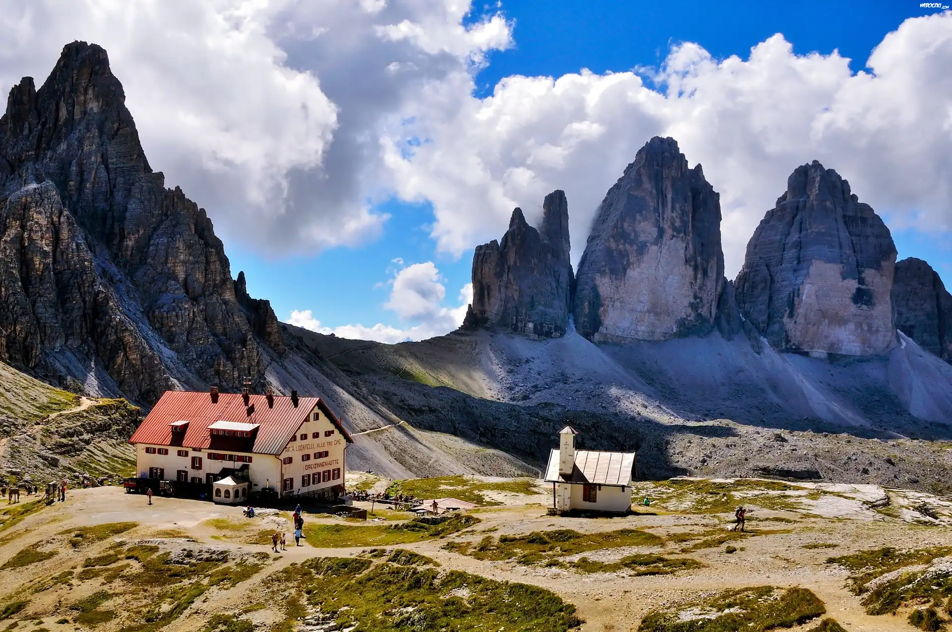 Góry, Włochy, Chmury, Domy, Ludzie
