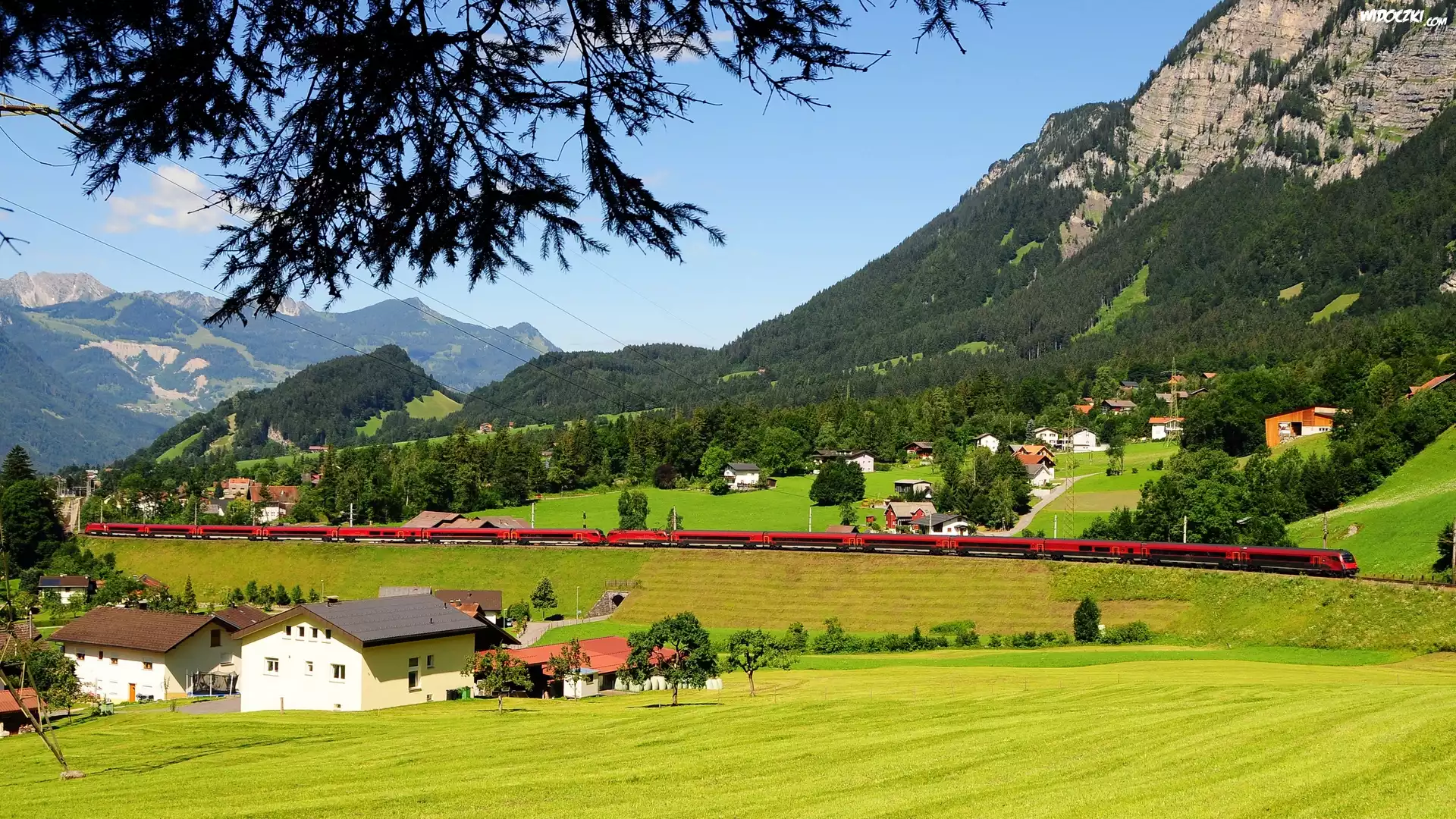 Zdjęcia, Góry, Lasy, Drzewa, Domy, Pociąg