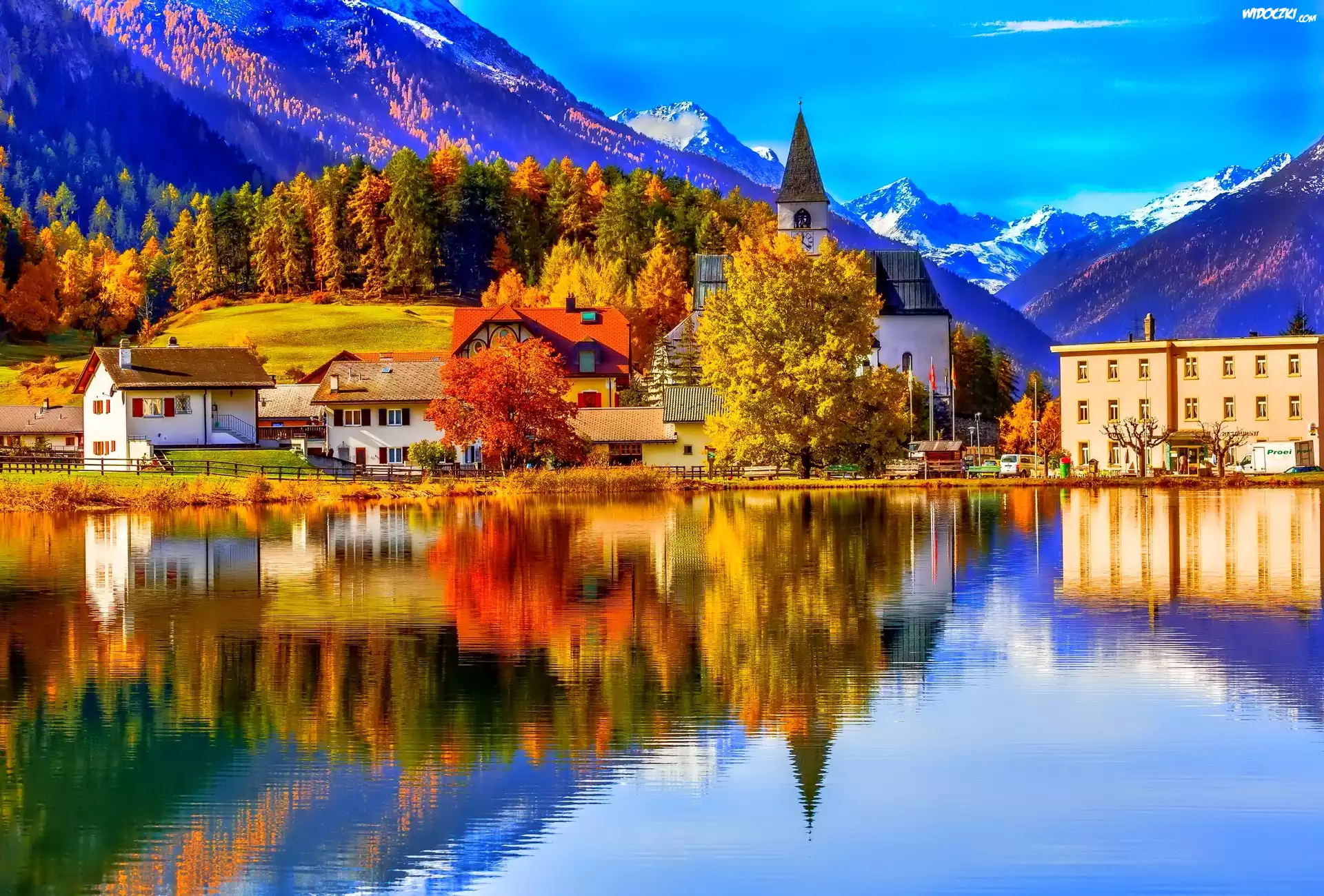Zdjęcia, Góry, Jezioro, Domy, Jesień