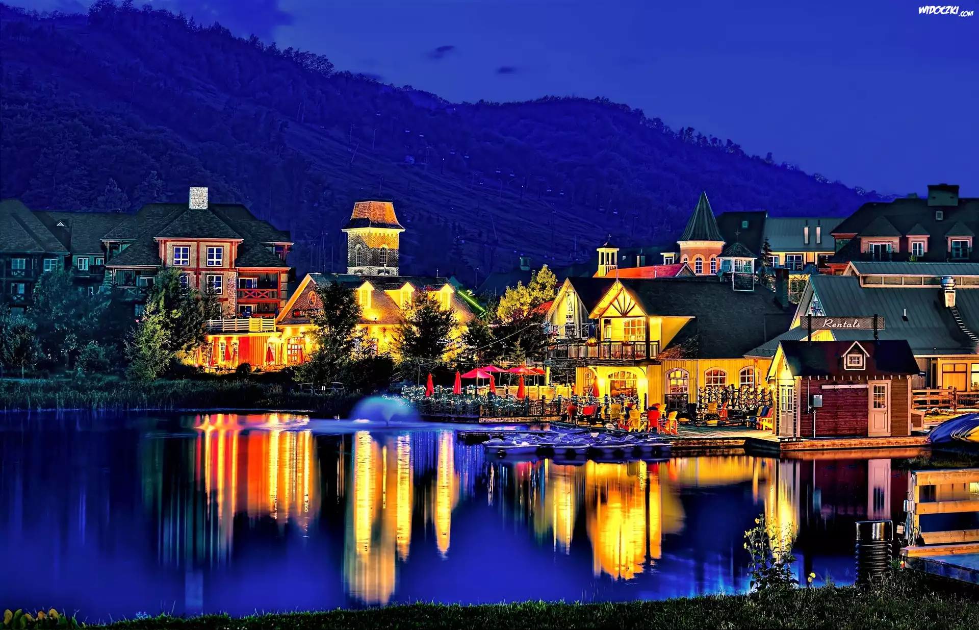 Góry, Jezioro, Wieczór, Oświetlone, Domy, Odbicie