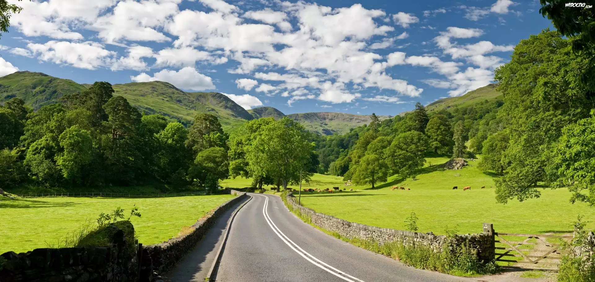 Góry, Drzewa, Chmury, Droga, Pastwisko