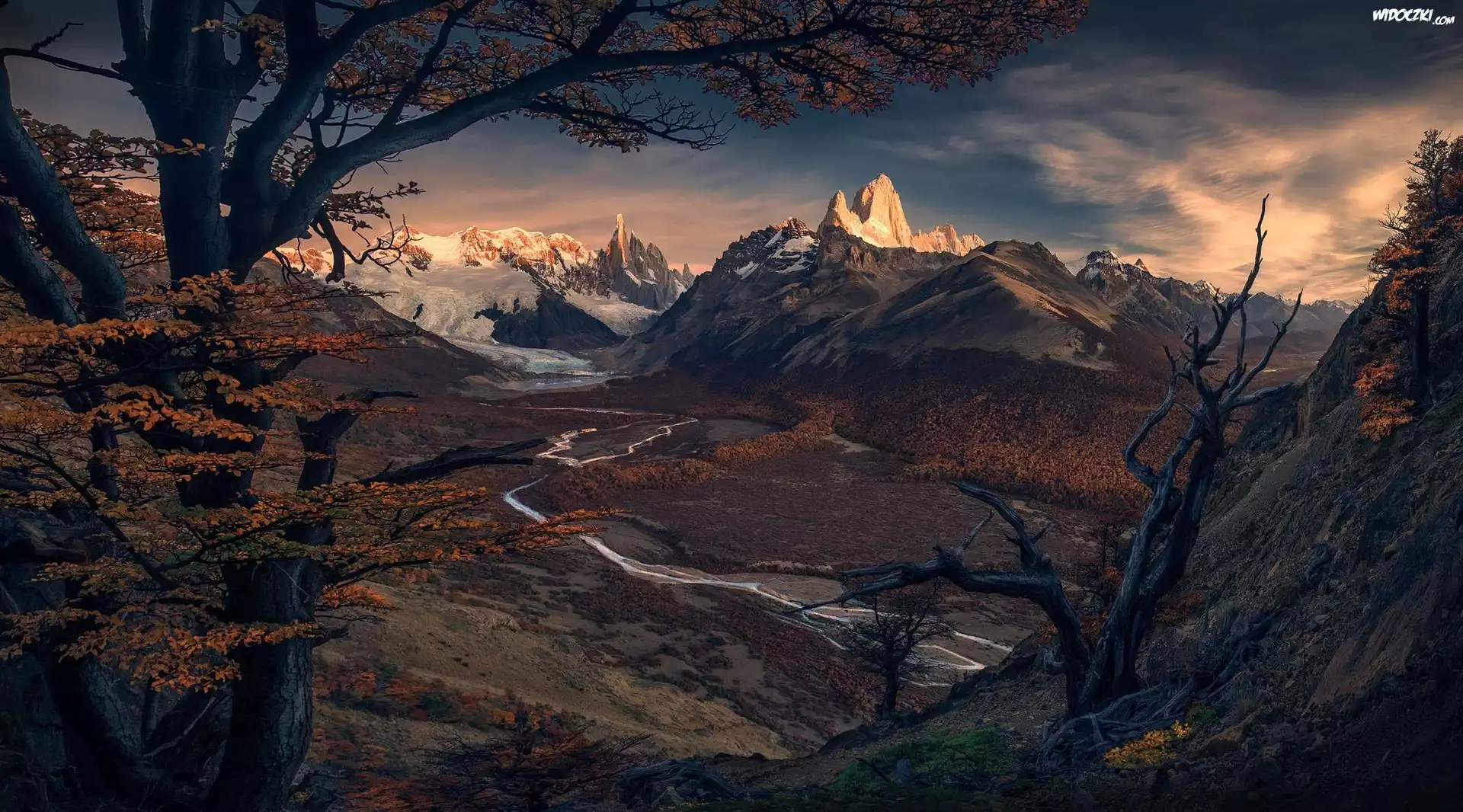 Argentyna, Park Narodowy Los Glaciares, Góry, Patagonia, Szczyt Fitz Roy, Jesień, Drzewa, Rzeka Rio de las Vueltas |