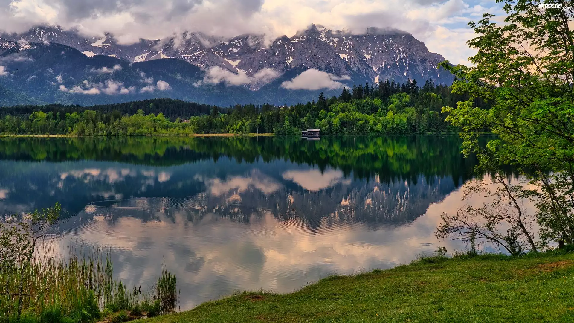 Zdjęcia, Jezioro Barmsee, Drzewa, Góry, Odbicie, Bawaria, Niemcy