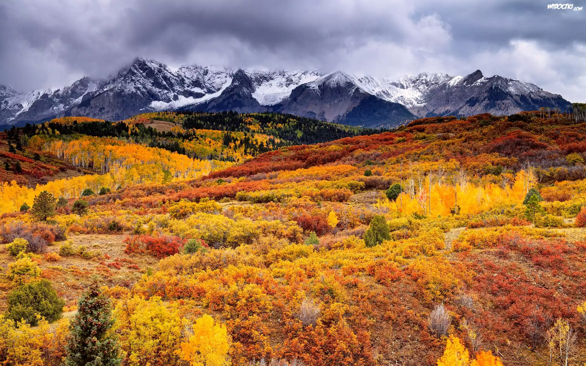 Góry, Niebo, Chmury, Drzewa, Jesień