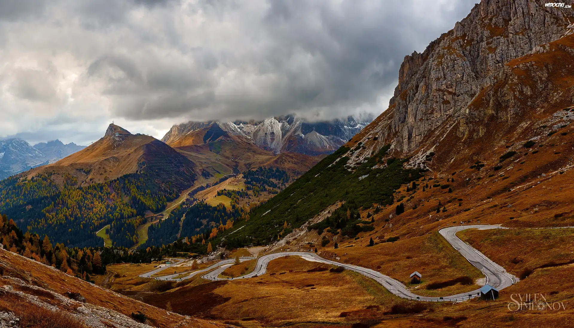 Zdjęcia, Góry, Włochy, Dolomity, Droga, Drzewa, Domy