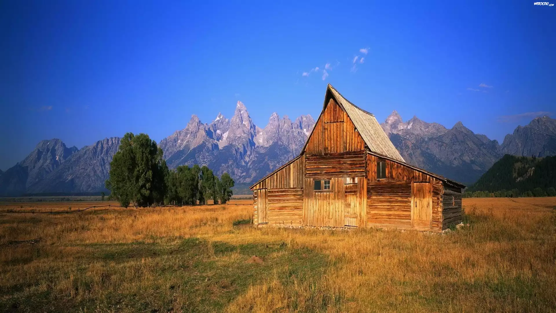 Góry, Domek, Drewniany, Drzewa, Trawa