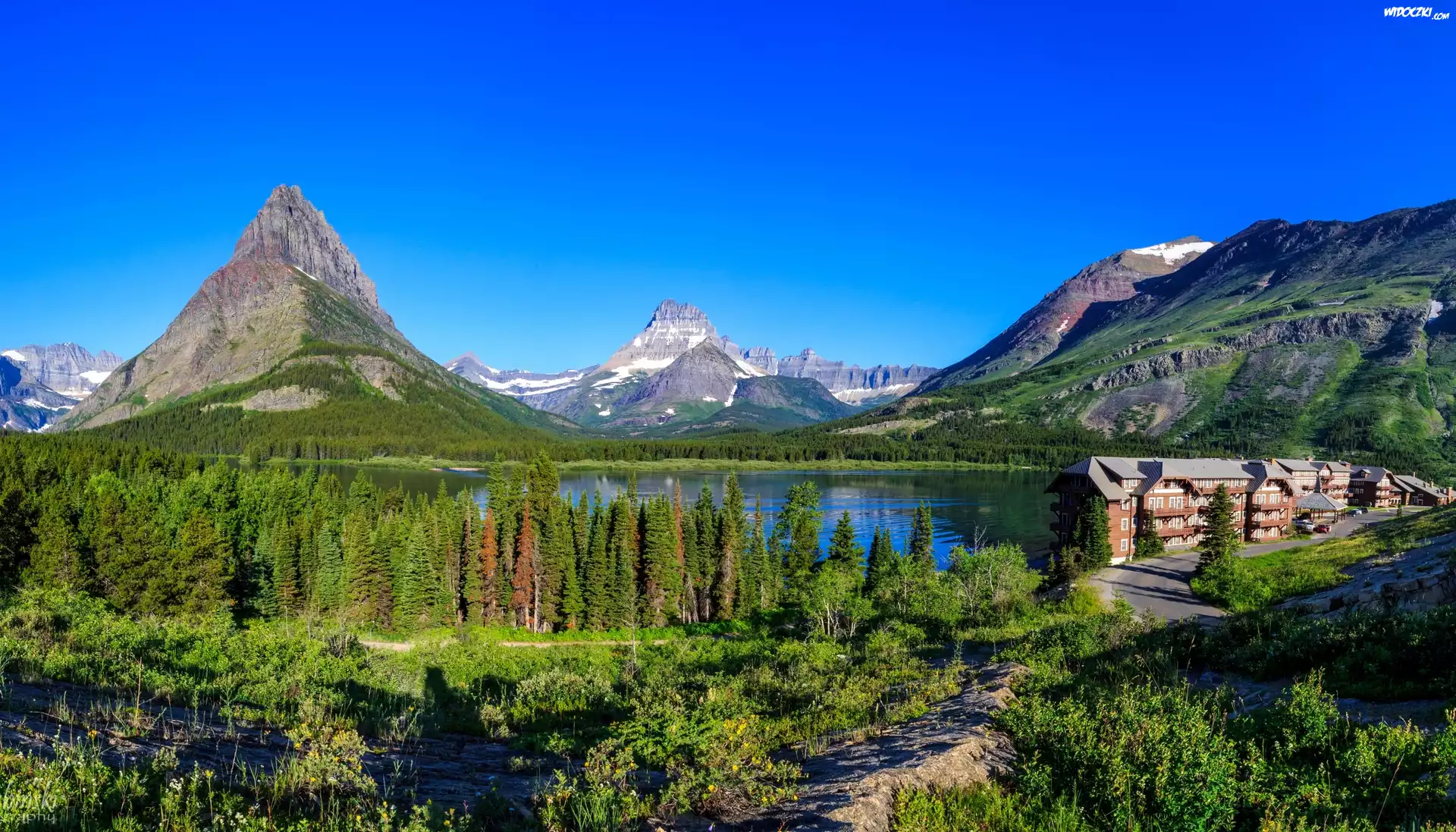 Zdjęcia, Góry, Jezioro, Drzewa, Domy