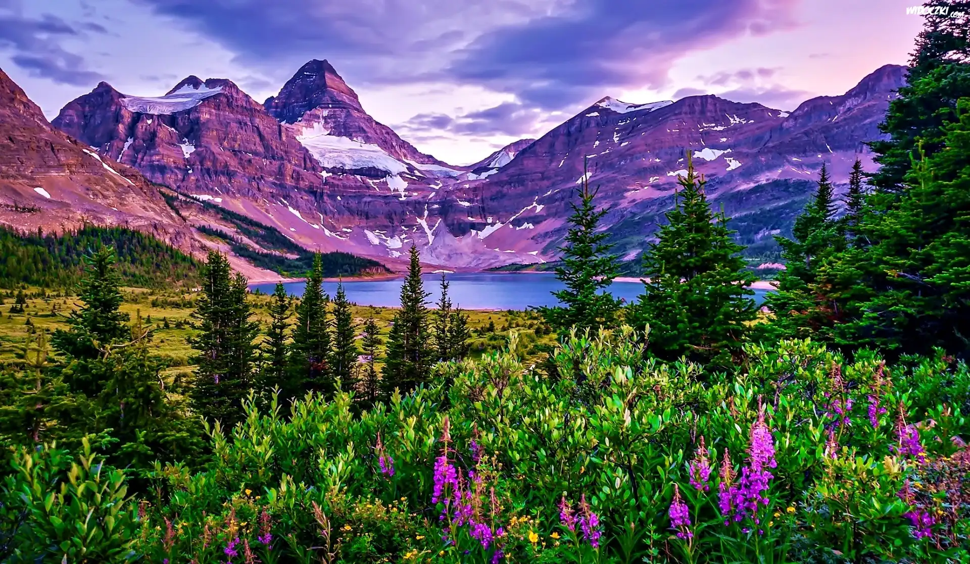 Góry, Jezioro, Drzewa, Kwiaty