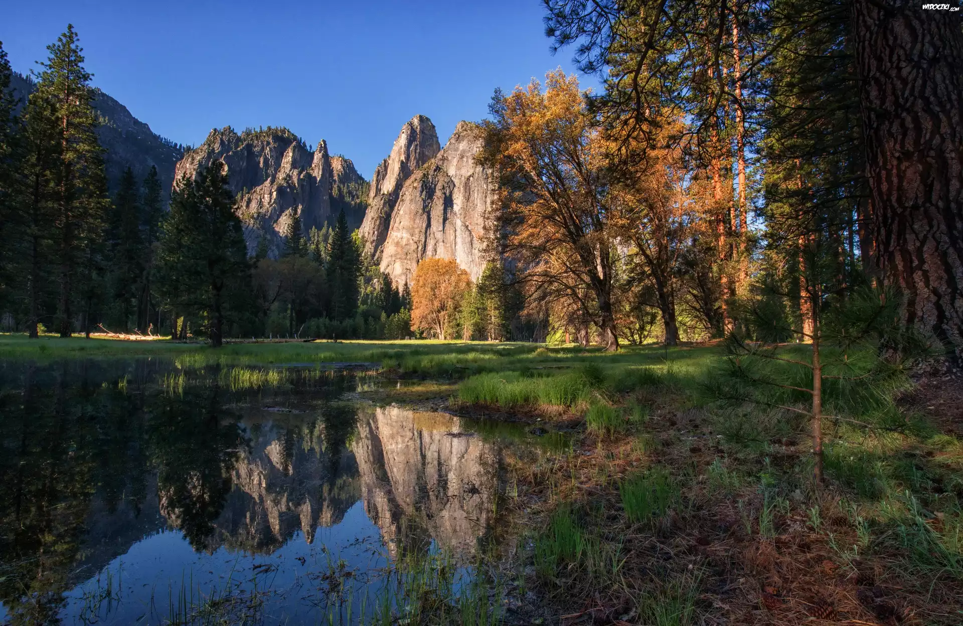 Zdjęcia, Góry, Jezioro, Drzewa, Odbicie