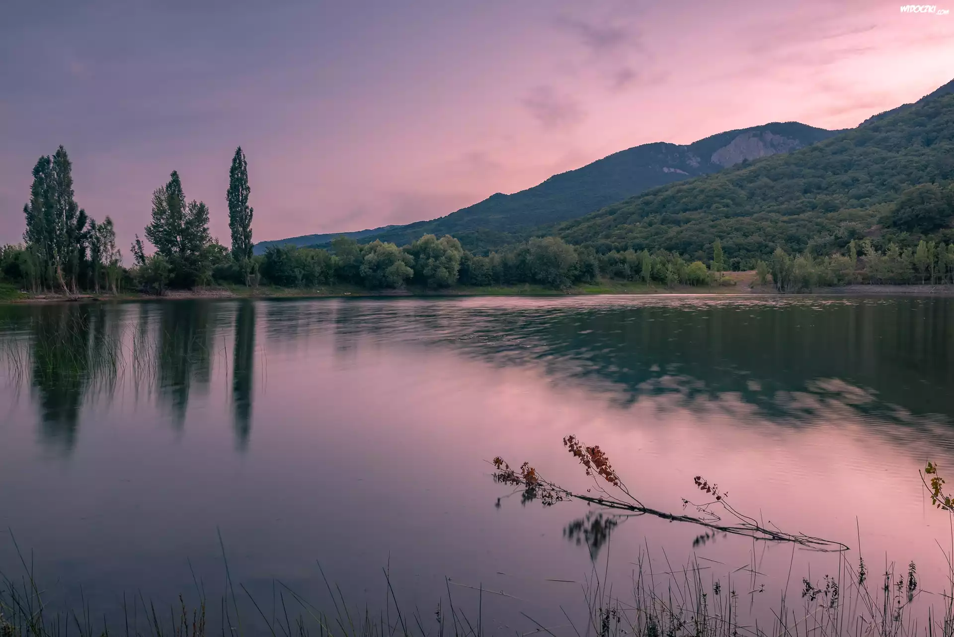 Góry, Jezioro, Drzewa, Poranek