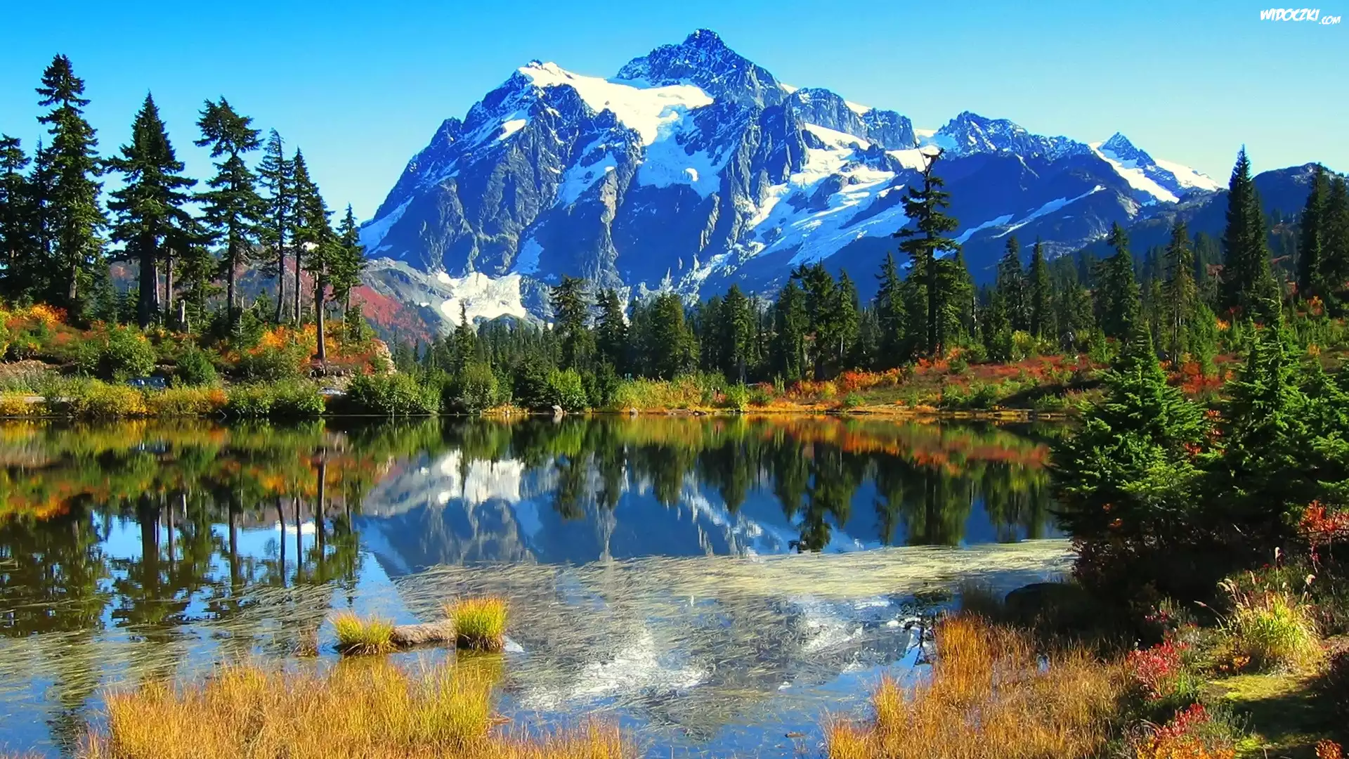 Zdjęcia, Góry, Jezioro, Drzewa, Trawa
