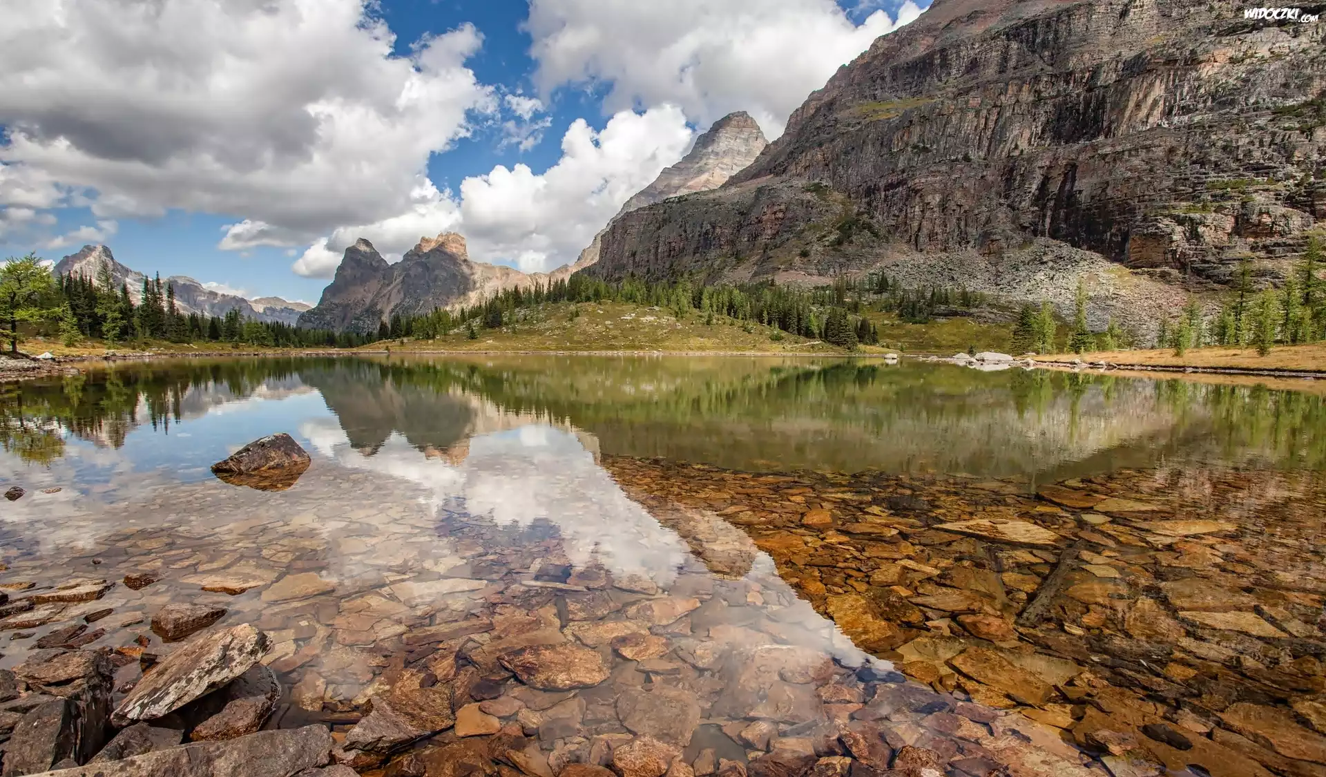 Zdjęcia, Góry, Jezioro, Kamienie, Drzewa, Chmury