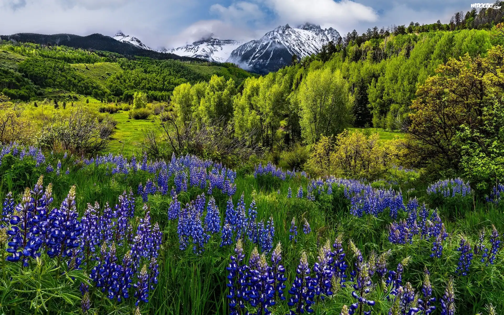 Zdjęcia, Stany Zjednoczone, Kolorado, Góry, San Juan Mountains, Mount Sneffels, Drzewa, Łąka, Kwiaty, Łubin