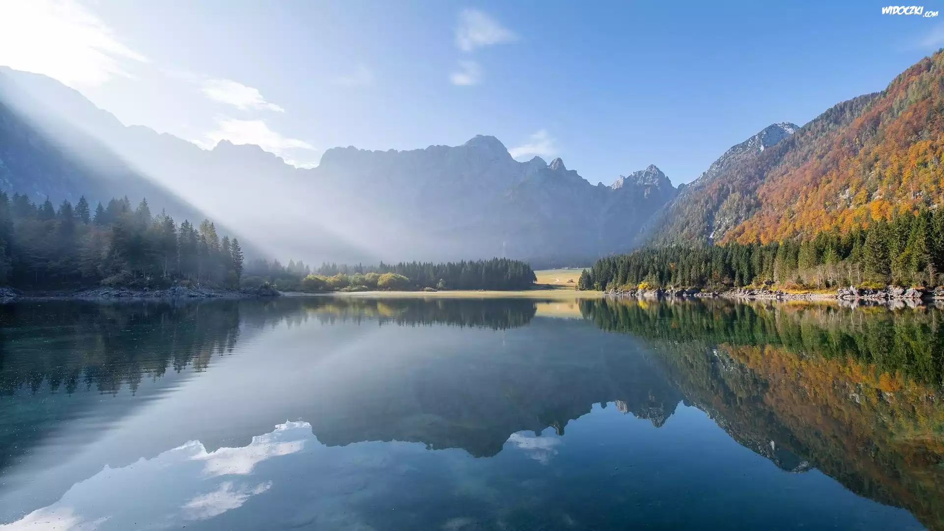 Góry, Alpy Julijskie, Jezioro, Fusine Lake, Drzewa, Odbicie, Włochy