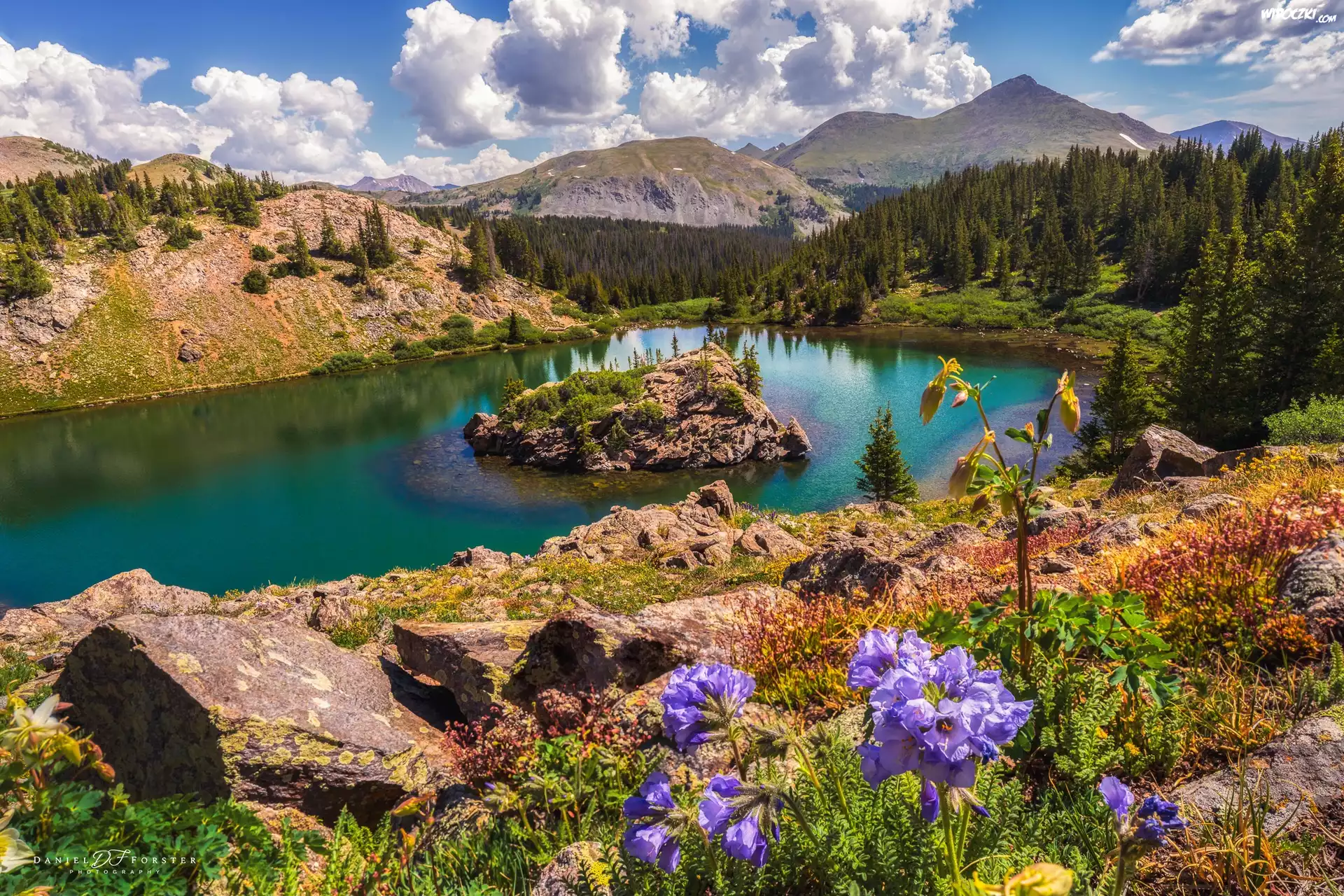 Zdjęcia, Góry, Jezioro, Wysepka, Skały, Kamienie, Las, Drzewa, Kwiaty, Chmury