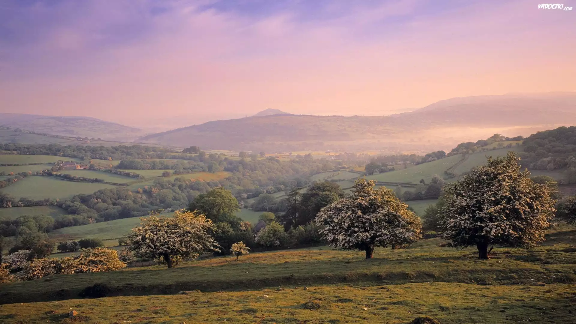 Zdjęcia, Góry, Pola, Drzewa, Mgła