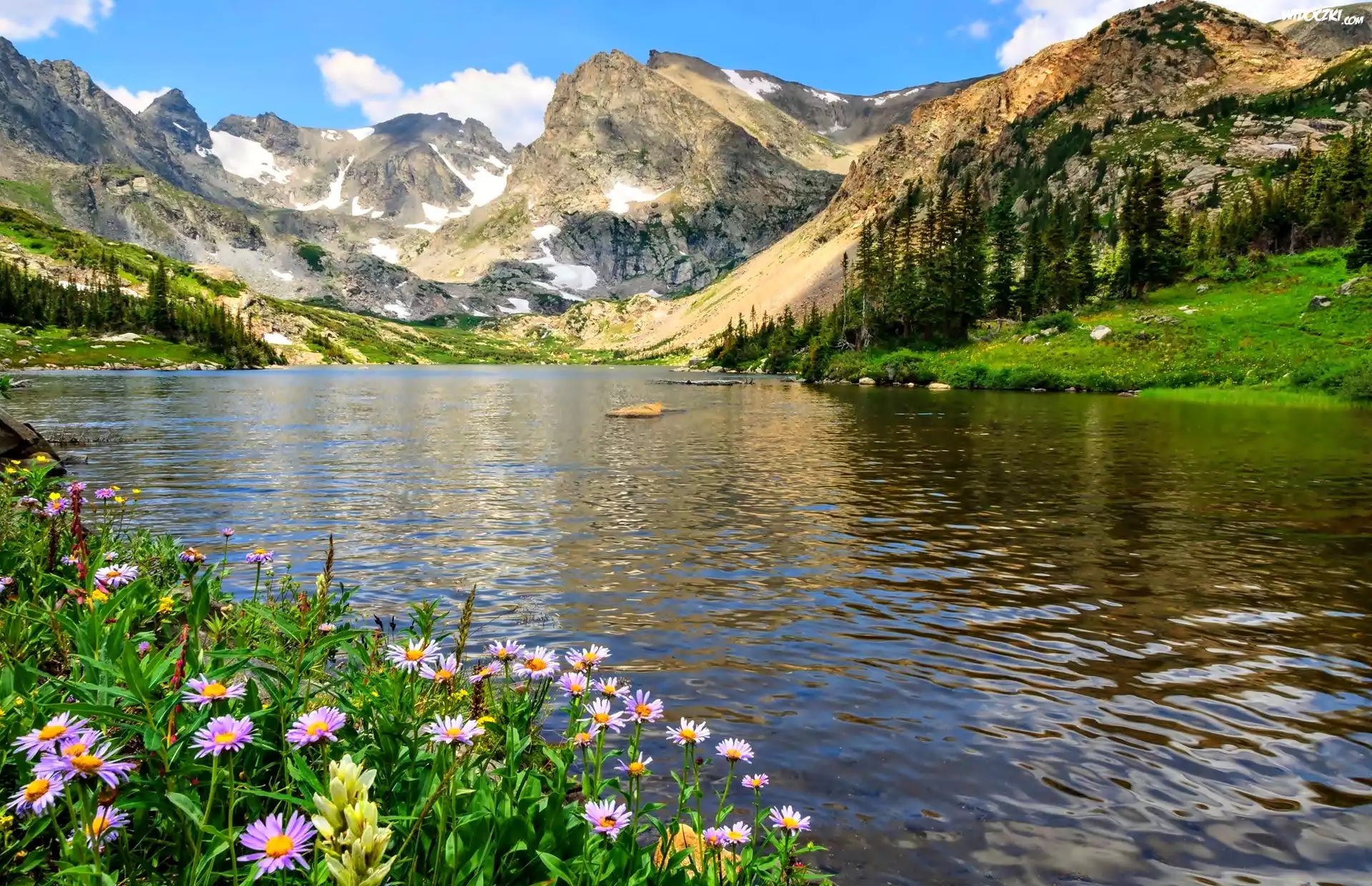 Góry, Rzeka, Drzewa, Kwiaty