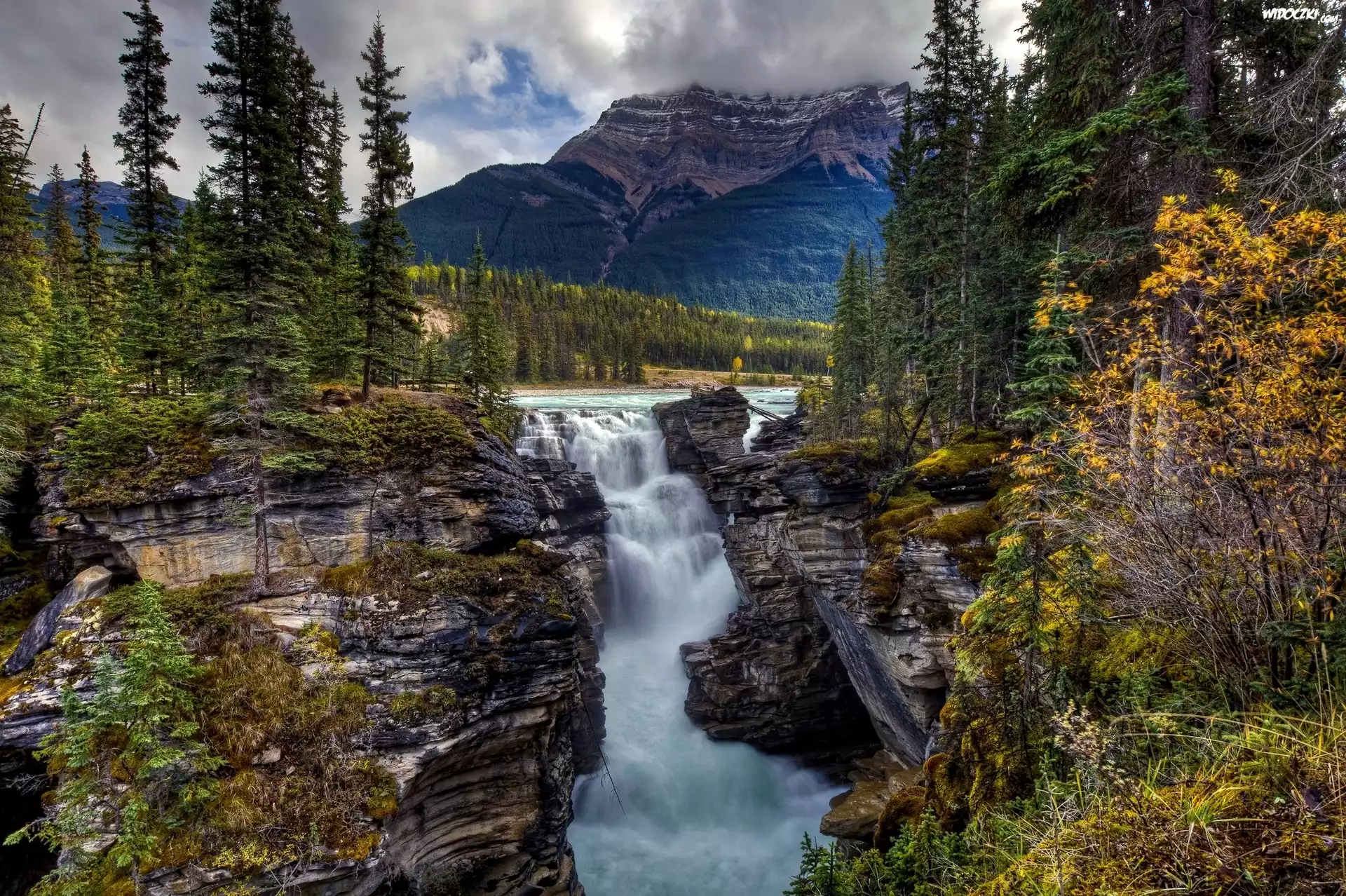 Zdjęcia, Góry, Skały, Drzewa, Wodospad