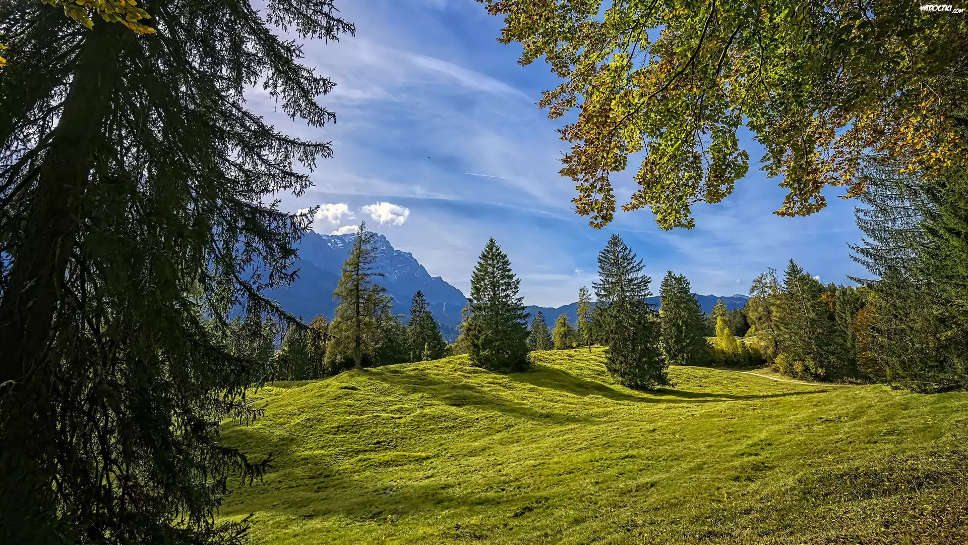 Zdjęcia, Drzewa, Łąka, Trawa, Góry