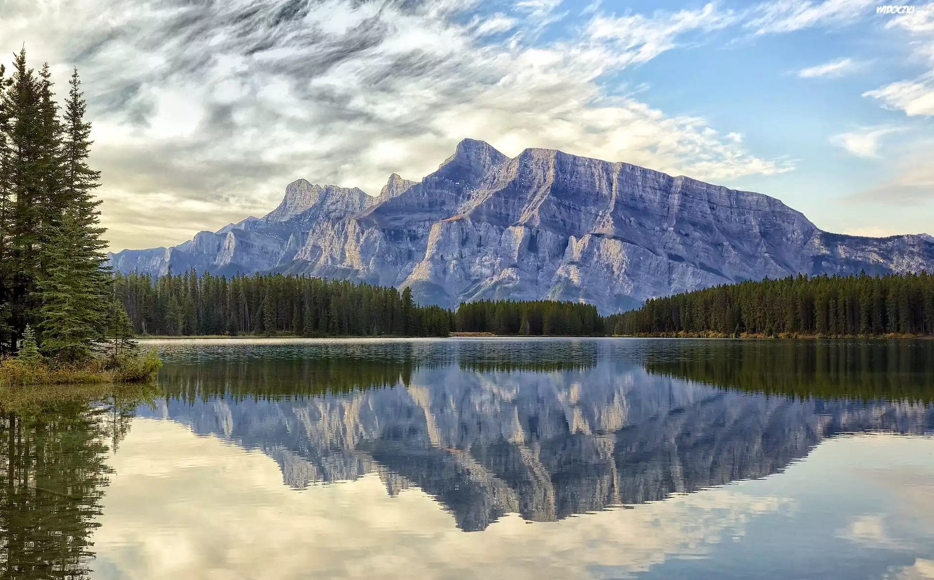 Góry Mount Rundle, Jezioro Two Jack Lake, Park Narodowy Banff, Prowincja Alberta, Kanada, Odbicie, Drzewa, Świerki |