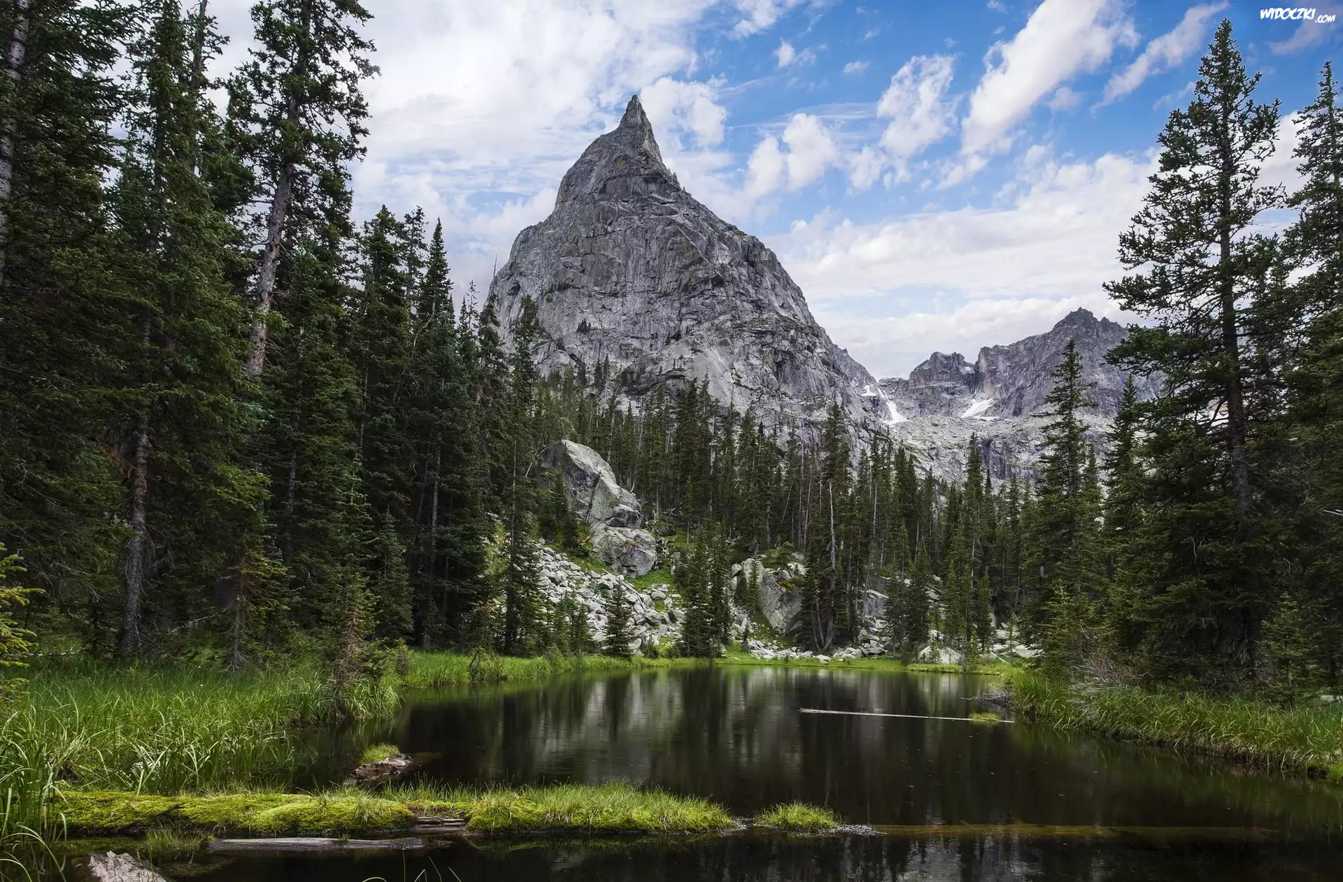 Góry, Szczyt Lone Eagle Peak, Indian Peaks Wilderness, Stan Kolorado, Stany Zjednoczone, Jezioro, Drzewa, Chmury |