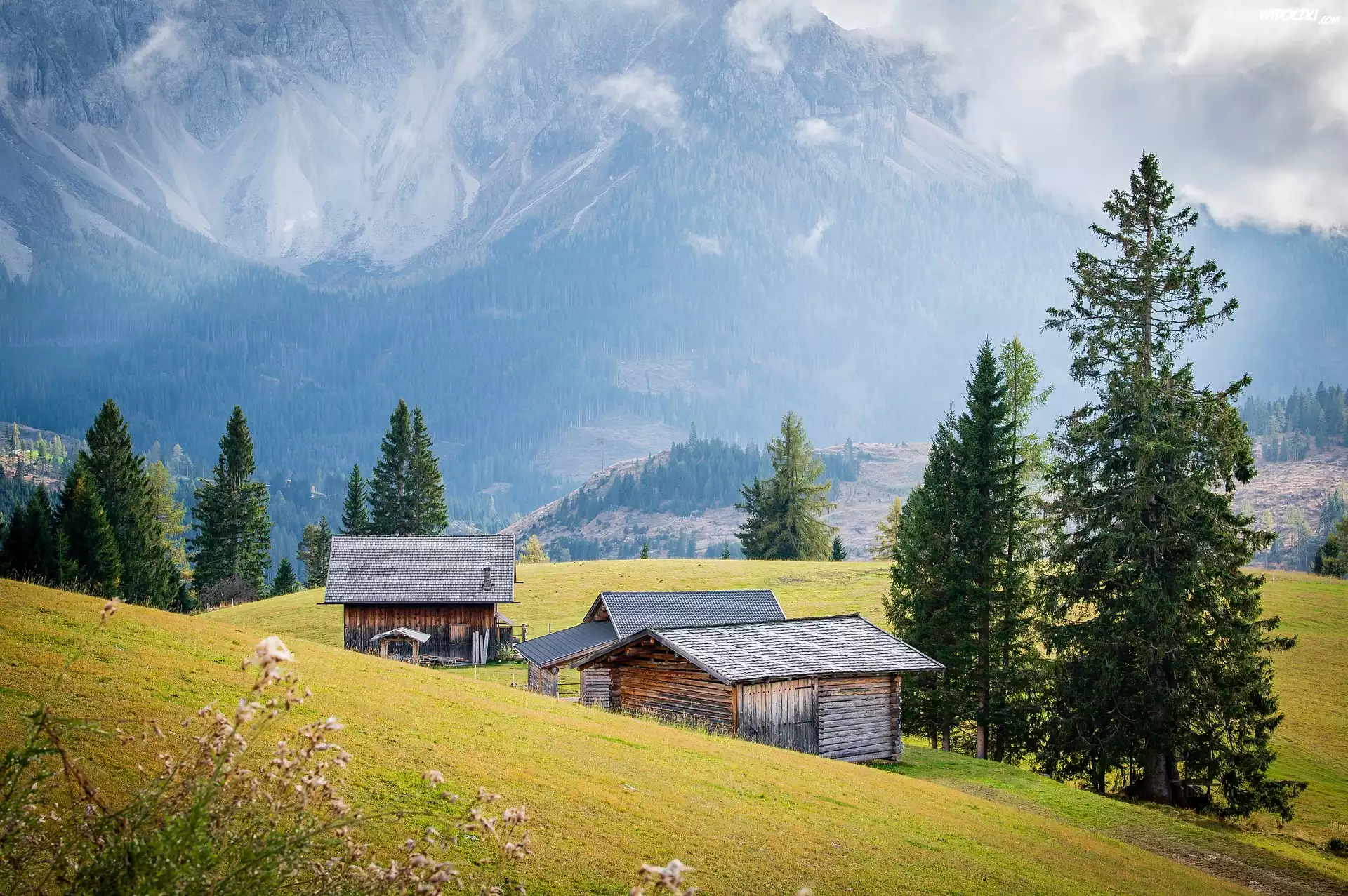Drewniane, Domy, Wzgórze, Góry, Mgła, Drzewa