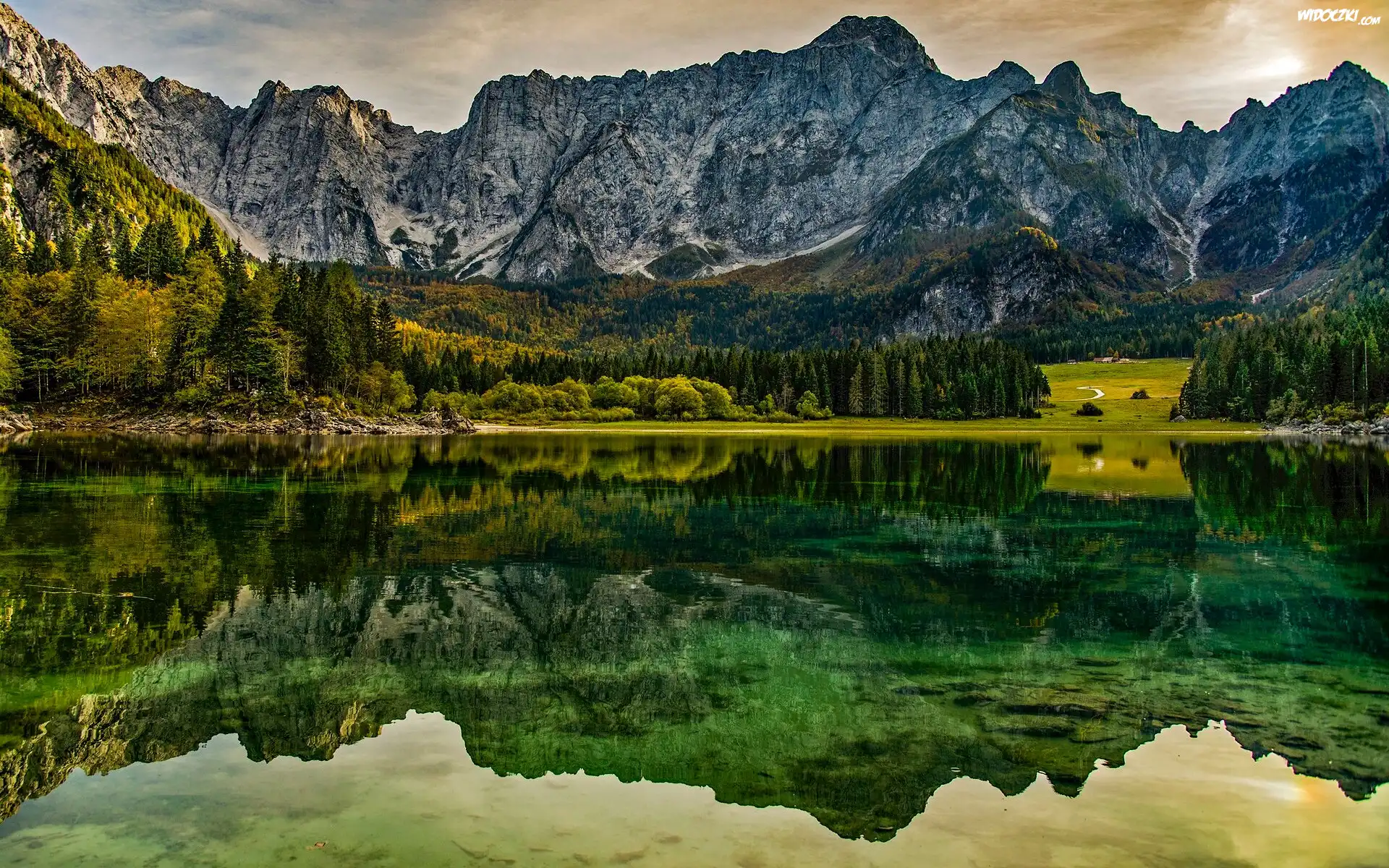 Góry, Jezioro, Zielone, Drzewa, Odbicie