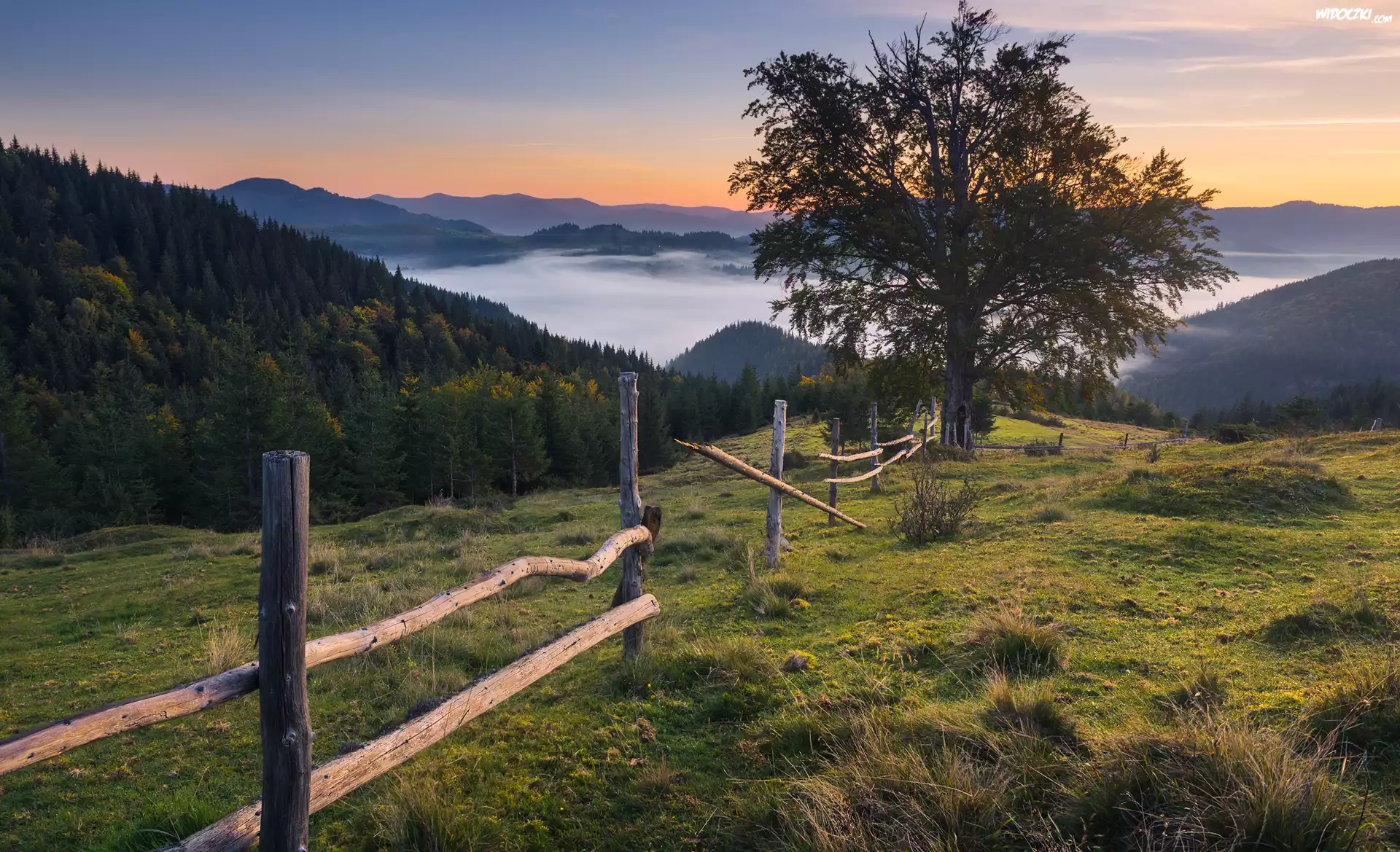 Zdjęcia, Łąka, Drzewo, Ogrodzenie, Góry, Mgła