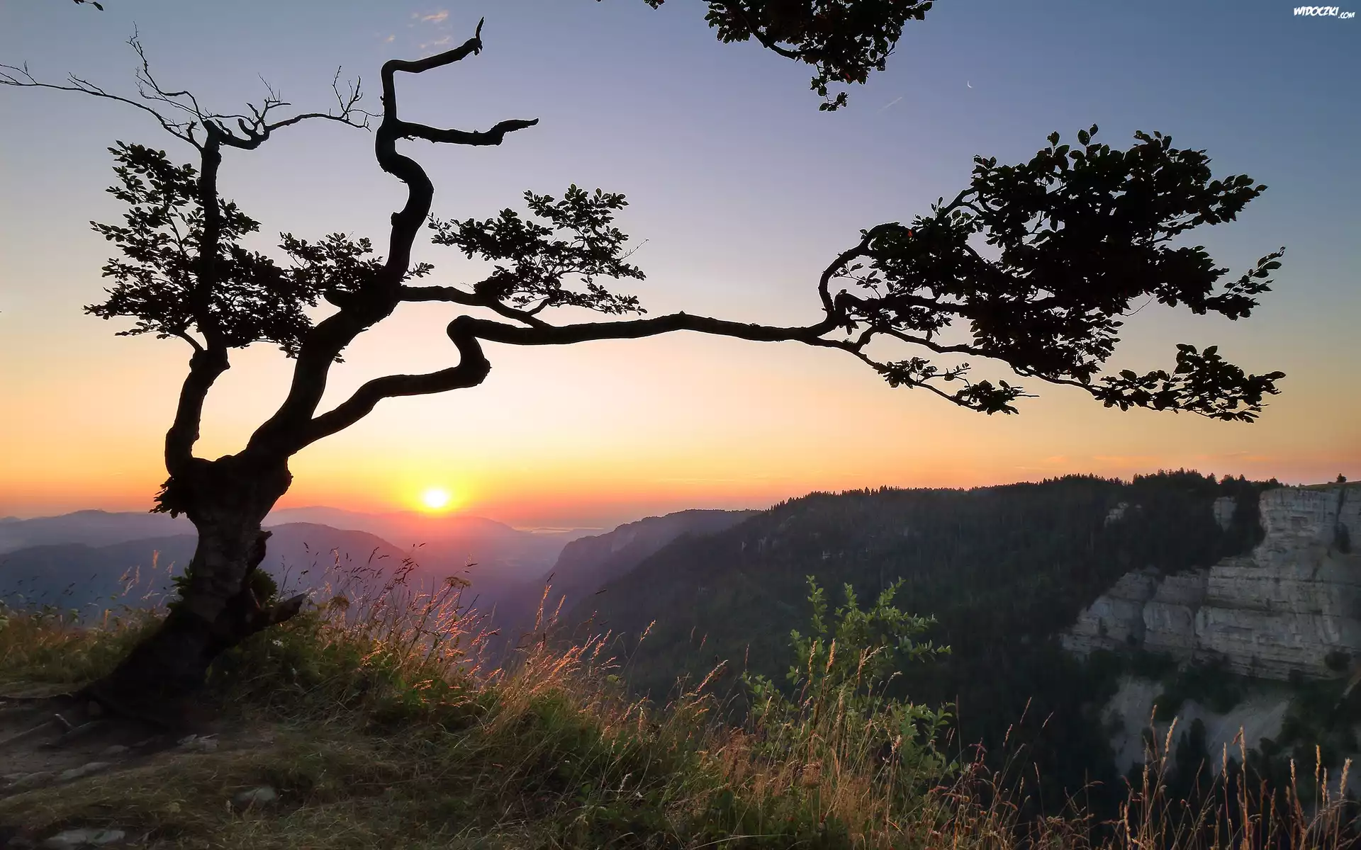 Zdjęcia, Góry, Wschód słońca, Drzewo, Trawa