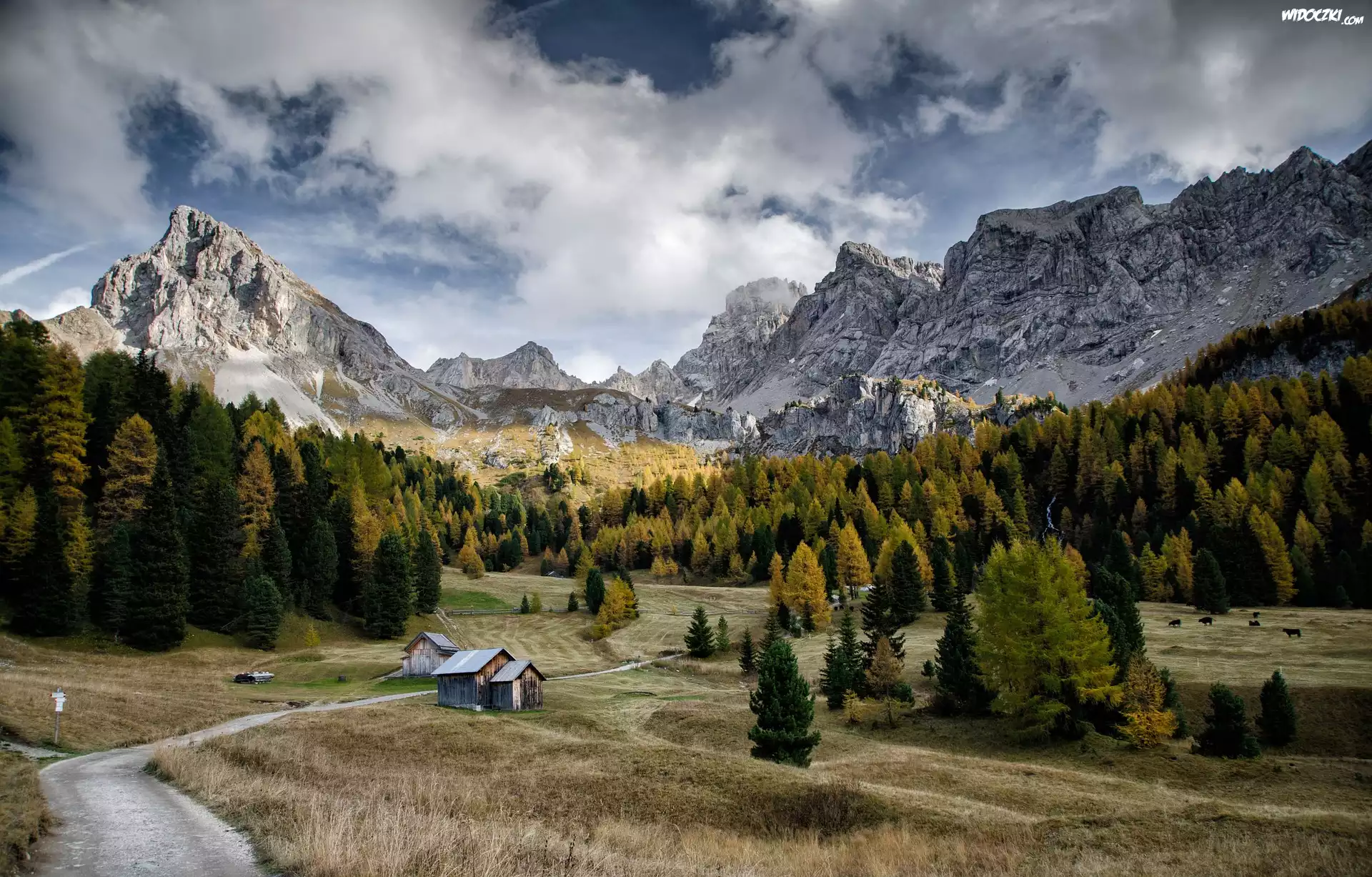 Góry, Dolomity, Dolina Fassa, Val di Fassa, Drzewa, Łąki, Domki, Ścieżka, Chmury, Pozza di Fassa, Włochy |